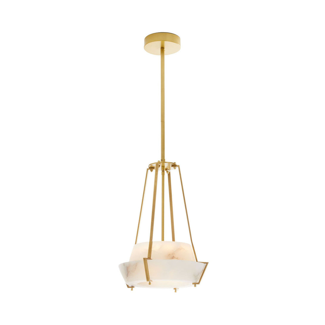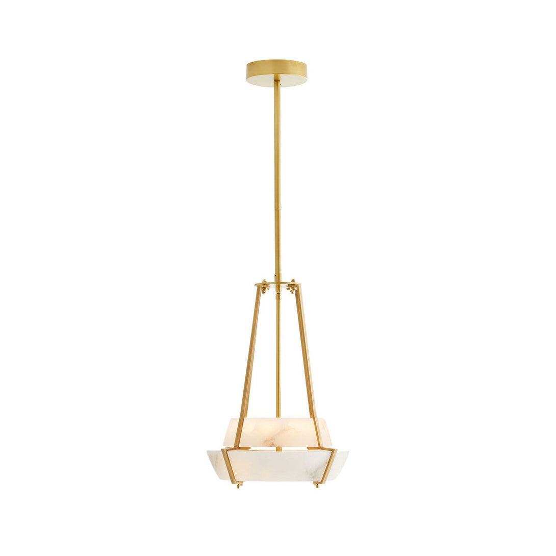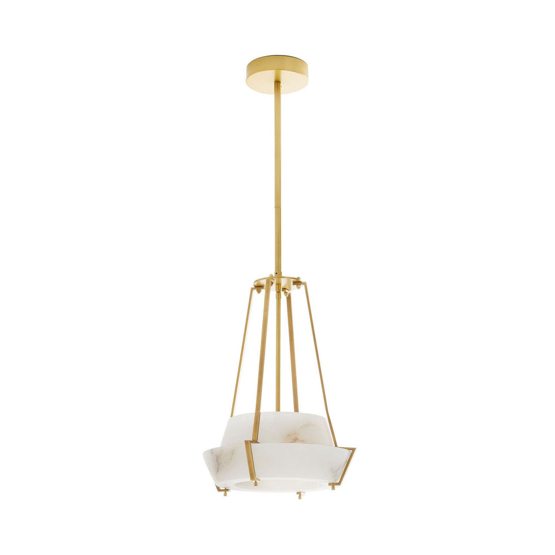 The Mohegan takes a modern approach to traditionalist pendant design. Two angular white alabaster rings are framed by gold iron in open form for a refined arrangement of elevated aesthetics. This layering of materials is striking stunning when not in use but is even more so when illuminated due to the integrated LED.