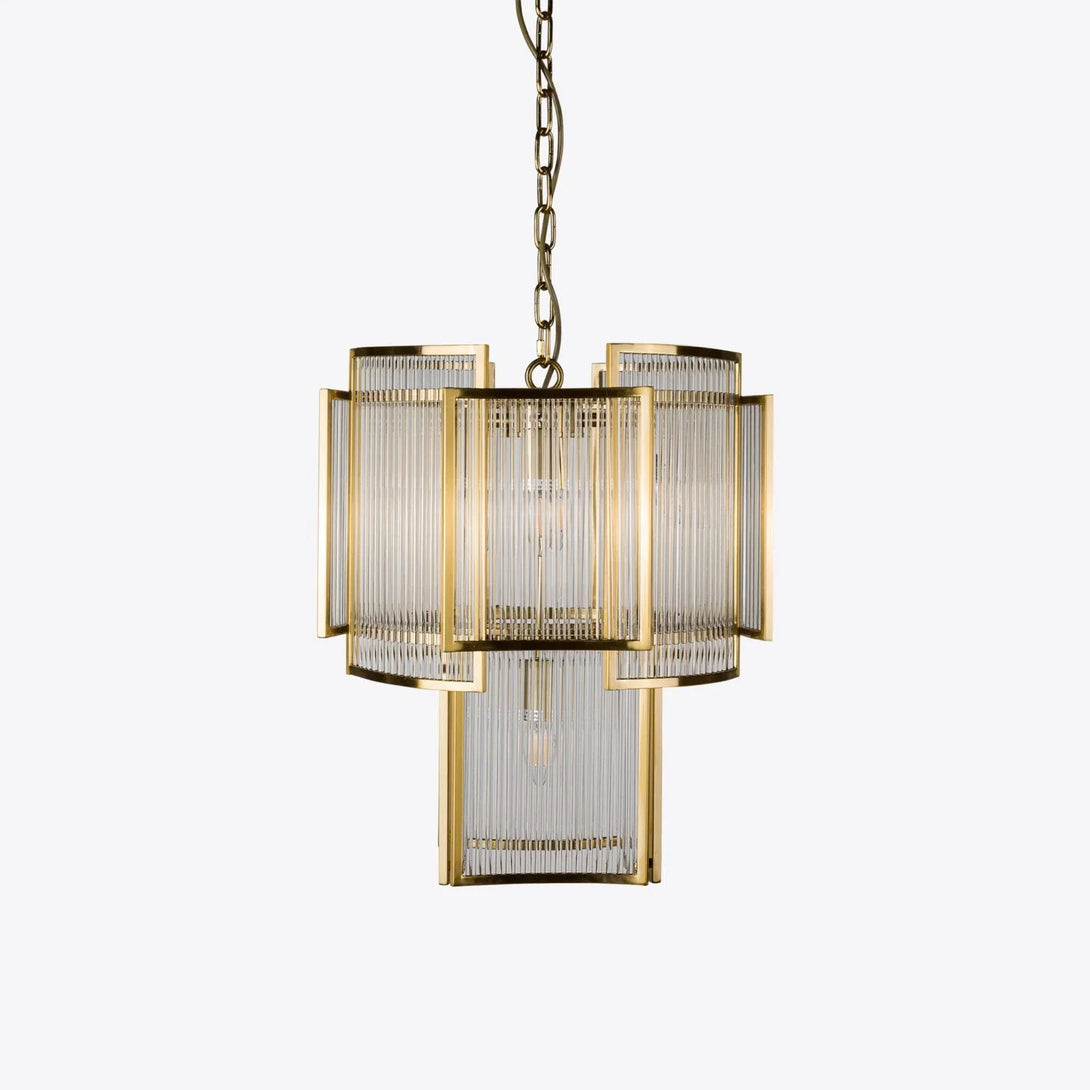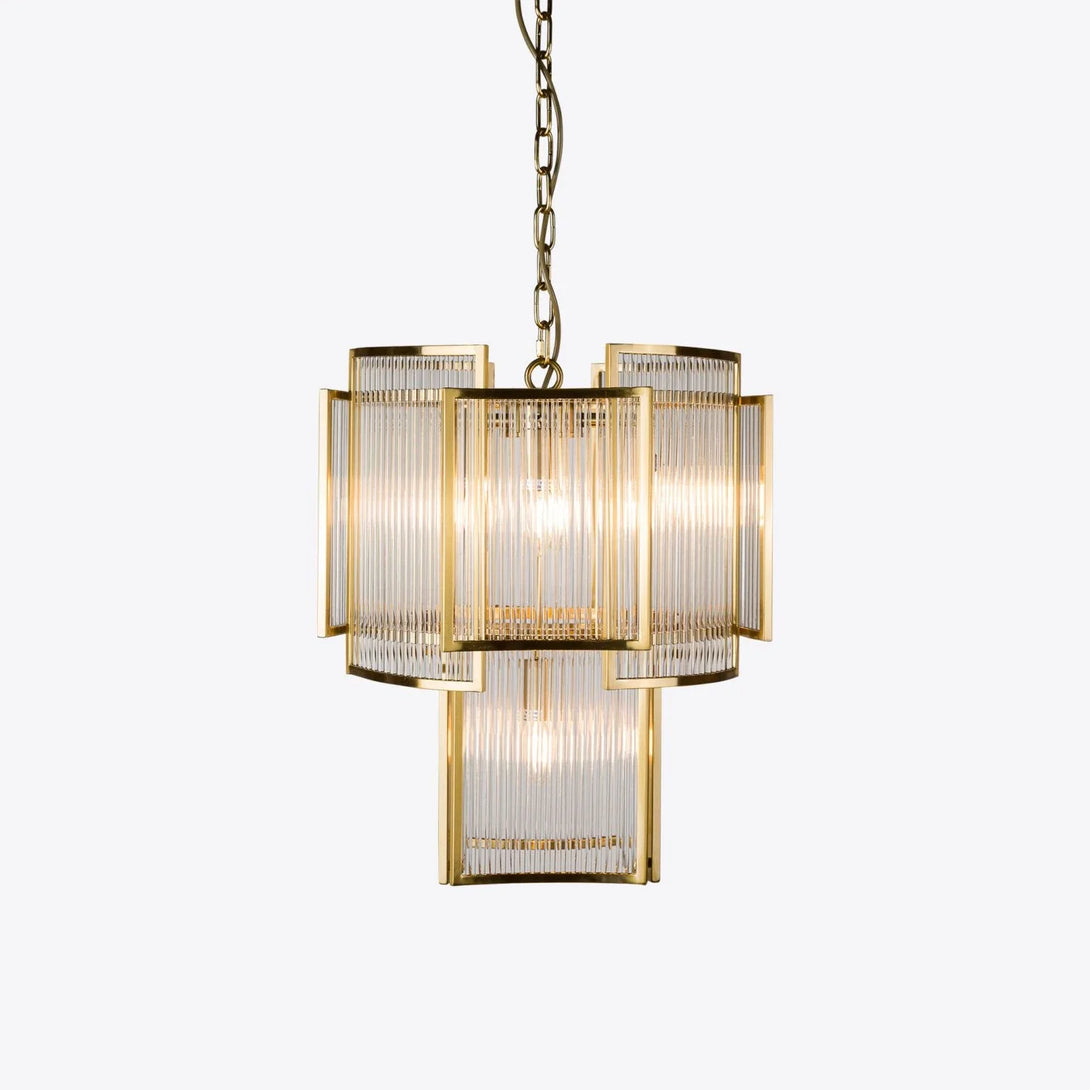 The Piccolo Monte Carlo chandelier features three elegant tiers of bronze finished metalwork and brass finished metalwork, enclosing clear glass rods to create a beautiful cascade effect. The perfect addition to a living or dining room.
