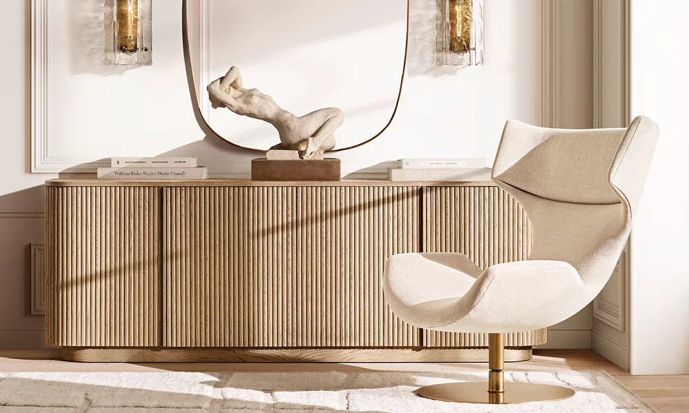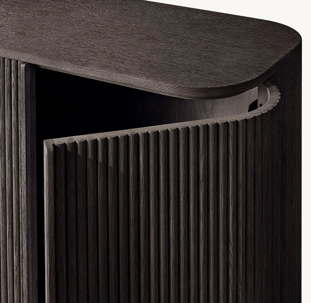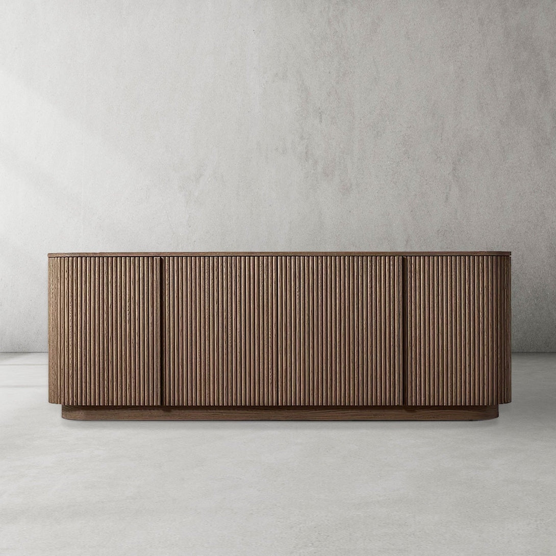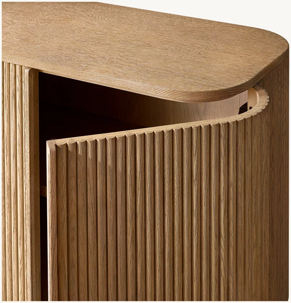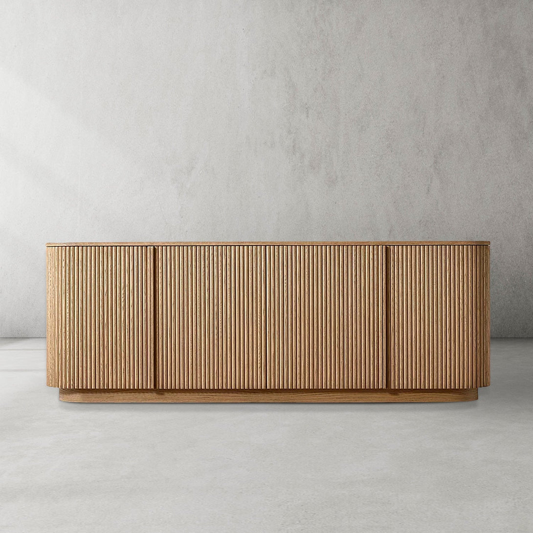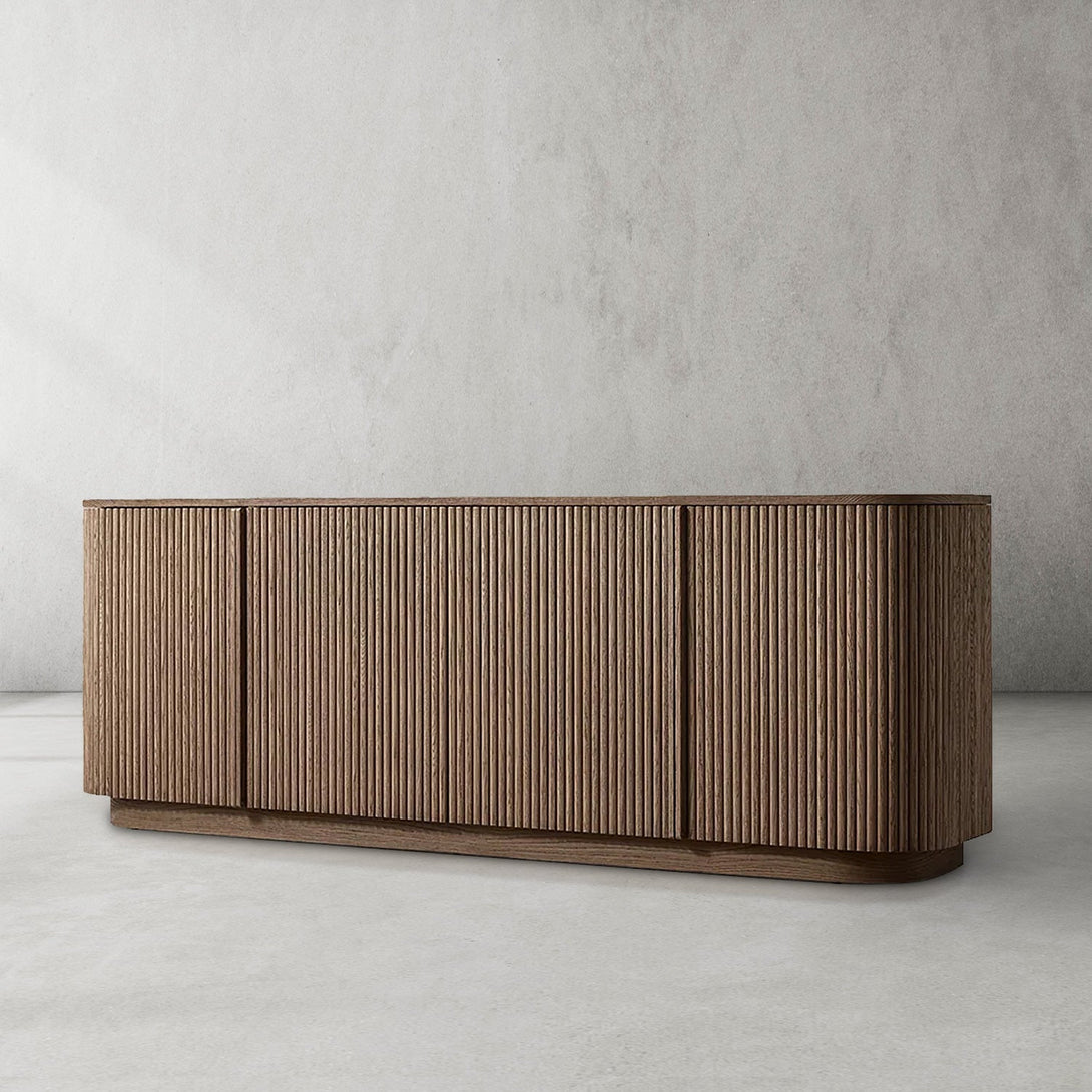 Key Features | - The Mulho sideboard is defined by its individually applied reeds of wire-brushed solid American oak, ensuring each piece is unique. - Features radius corners and doors that curve around the side, creating a fluid, uninterrupted silhouette that enhances any living space. |