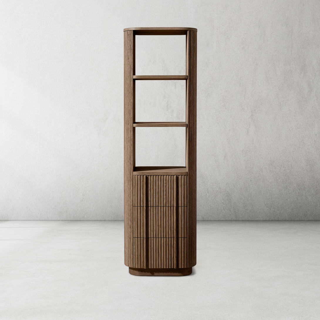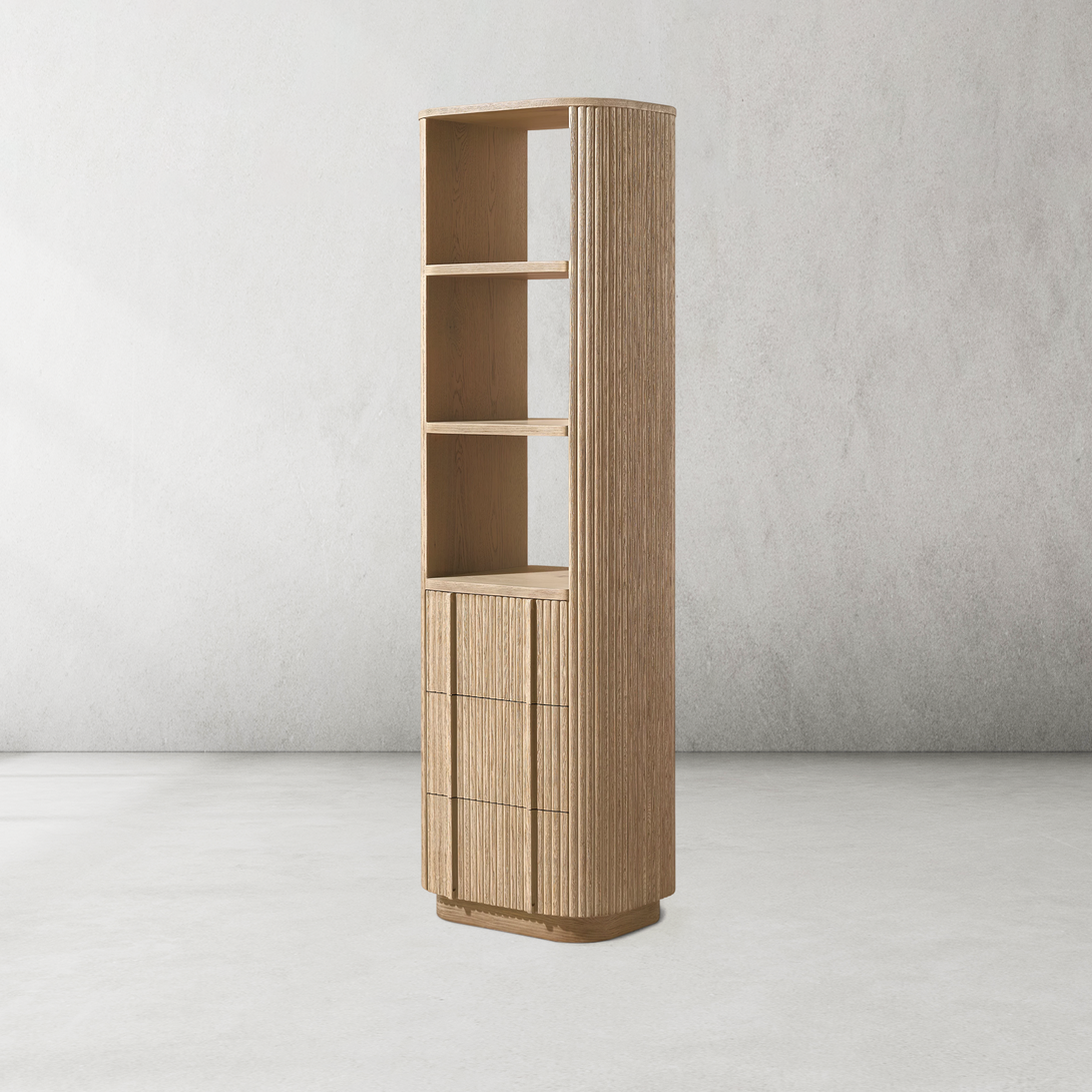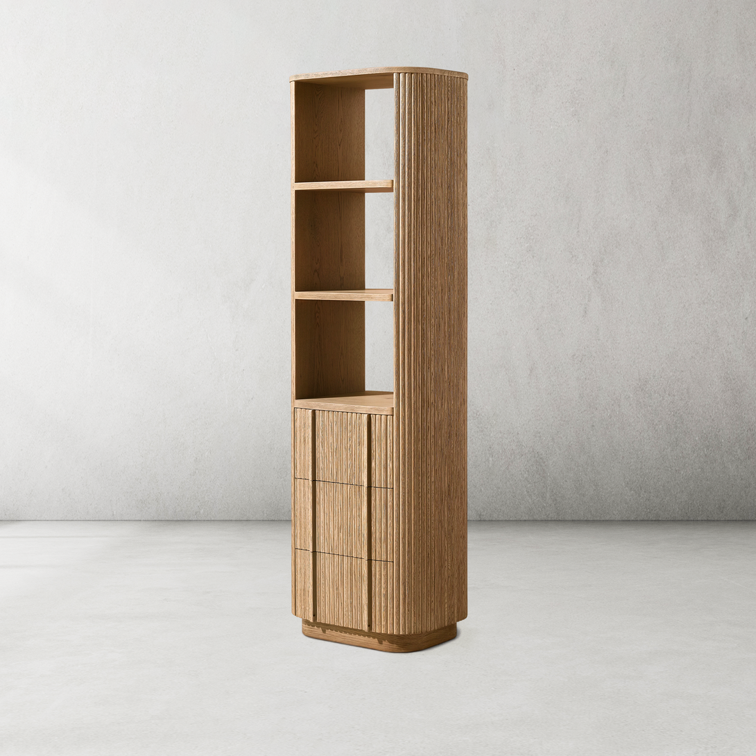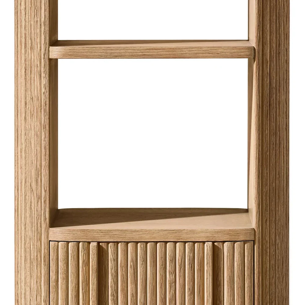 Key Features | - Crafted from kiln-dried solid American oak and engineered hardwood with American oak veneers. - Multistep finishing process gives the table a matte surface with visible grain. - Vertical surfaces feature solid oak reeding for texture. - Doors have magnetic closures and soft-close hinges for smooth operation. - 3 soft-close drawers with integrated finger pulls; drawer interiors are finished to complement the exterior. - 2 fixed shelves. |