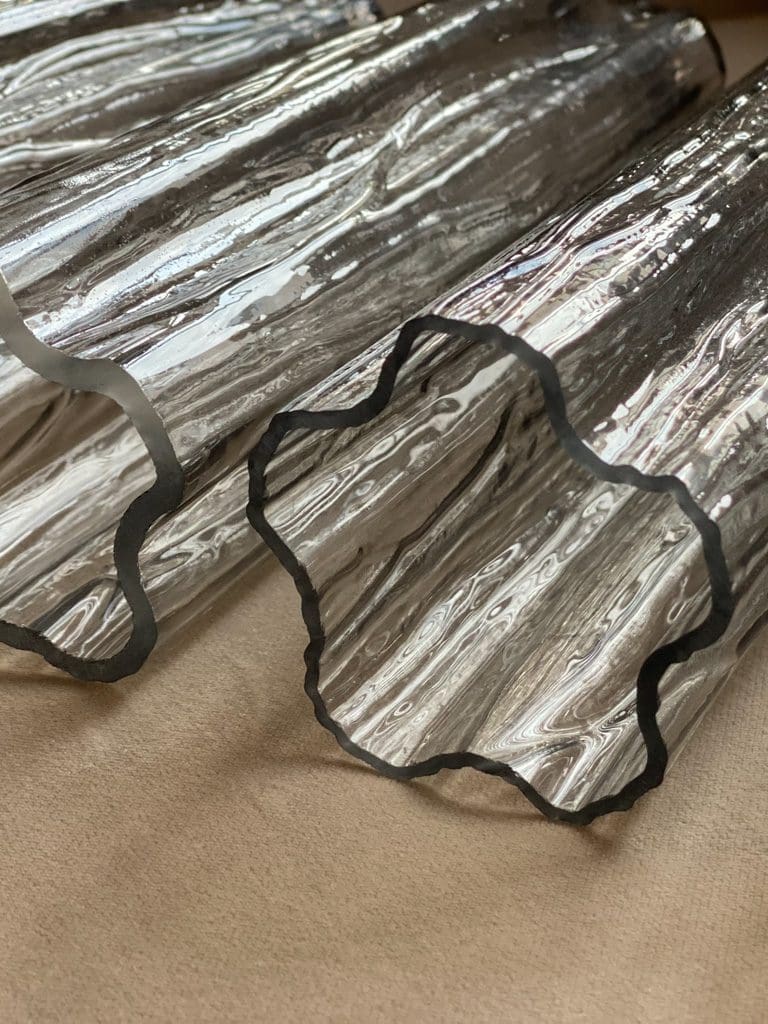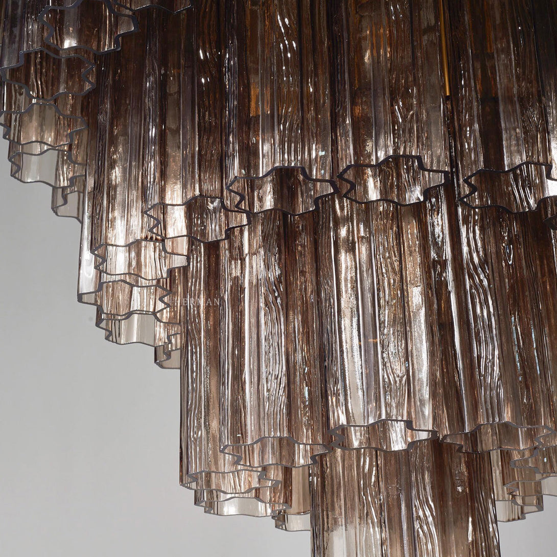 Experience the enchanting fusion of Italian glass craftsmanship and timeless elegance with our Italian Murano Chandelier. This beautiful chandelier features a patinated metal structure that supports 48 smoked glass tubes, each carefully shaped by skilled craftsmen in Murano.