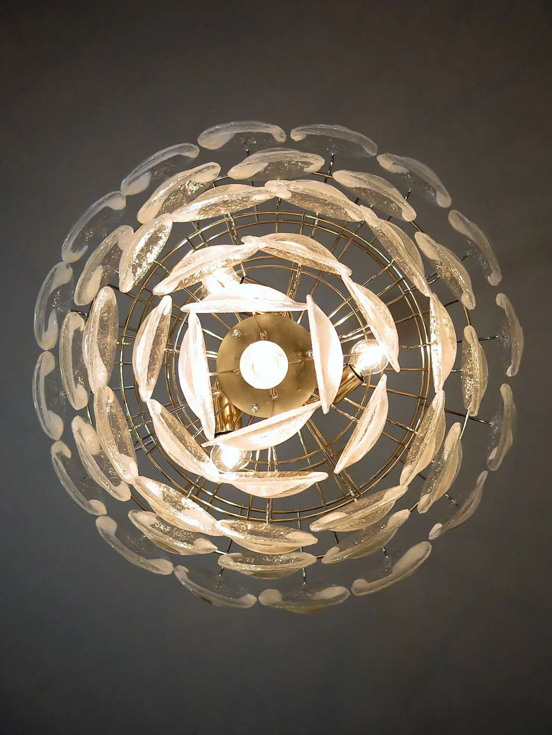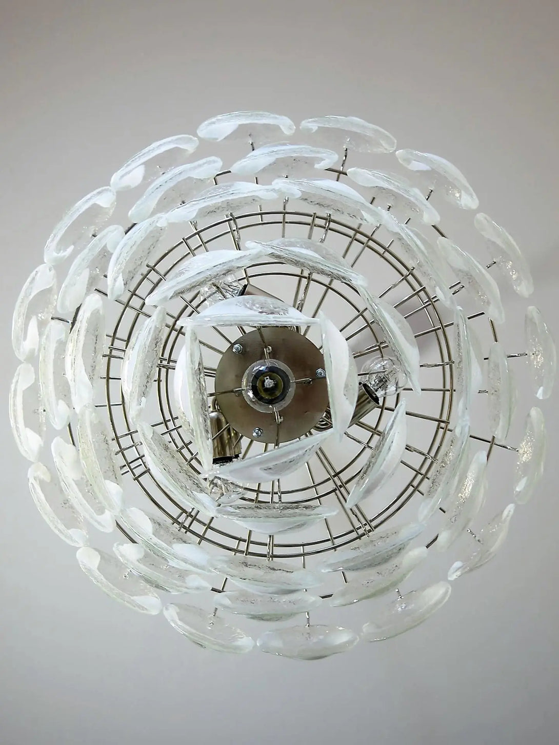 Add elegance to your decor with our Murano chandelier. Crafted in traditional Italian style, this chandelier features 50 exquisite lattimo glasses, also known as ‘shells’, suspended in a sleek chrome frame adorned with 50 finely crafted glasses. This isn’t just a lamp; it’s a captivating piece of art that adds a timeless charm to any room.