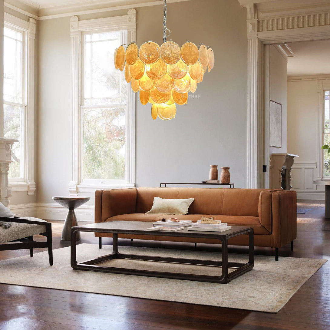 Murano Chandelier 57 Gold. 57 Gold alabaster iridescent glass disks. This chandelier is more than just a lighting fixture, it's a work of art that illuminates your surroundings.