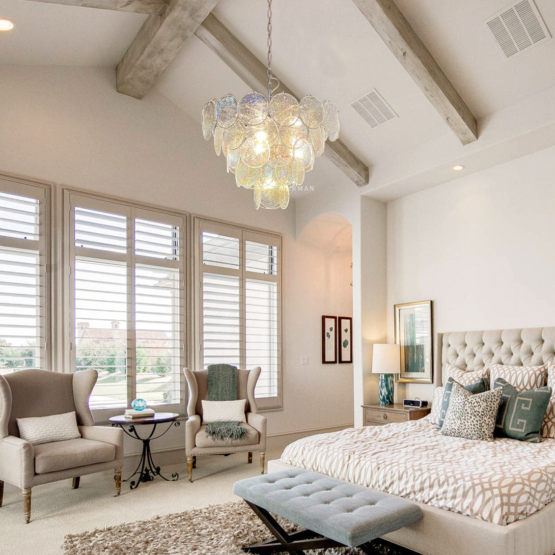 Murano Chandelier 57 Iridescent Glass. 57 Iridescent Glass alabaster iridescent glass disks. This chandelier is more than just a lighting fixture, it's a work of art that illuminates your surroundings.