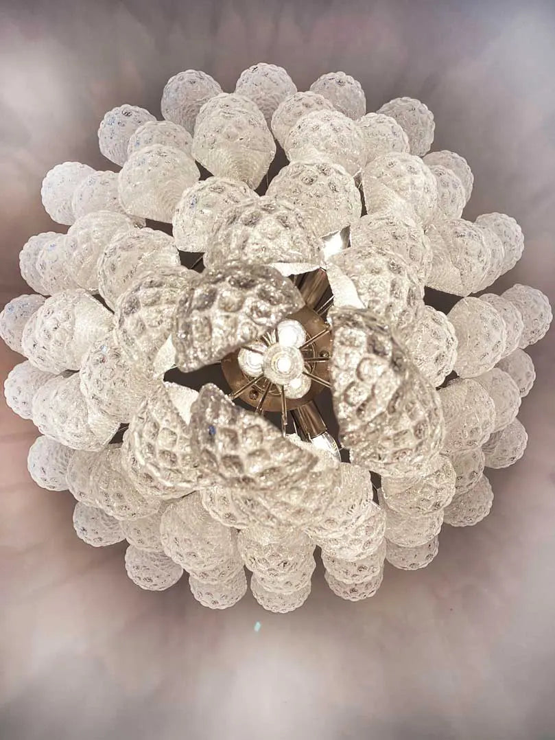 Expertly crafted in Murano, Italy, this stunning chandelier features 75 transparent glasses beautifully arranged in a captivating drop design. Elevate any space with its timeless elegance and the exceptional quality of each hand-blown glass piece. Add a touch of luxury to your home with this Murano masterpiece.