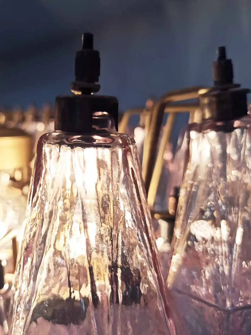 Treat your home to a radiant elegance with our Italian chandelier, a true gem of beauty and craftsmanship. This luxurious chandelier is made from 84 enchanting rose-colored Murano glass ‘poliedri’ that catches the light in a stunning way.