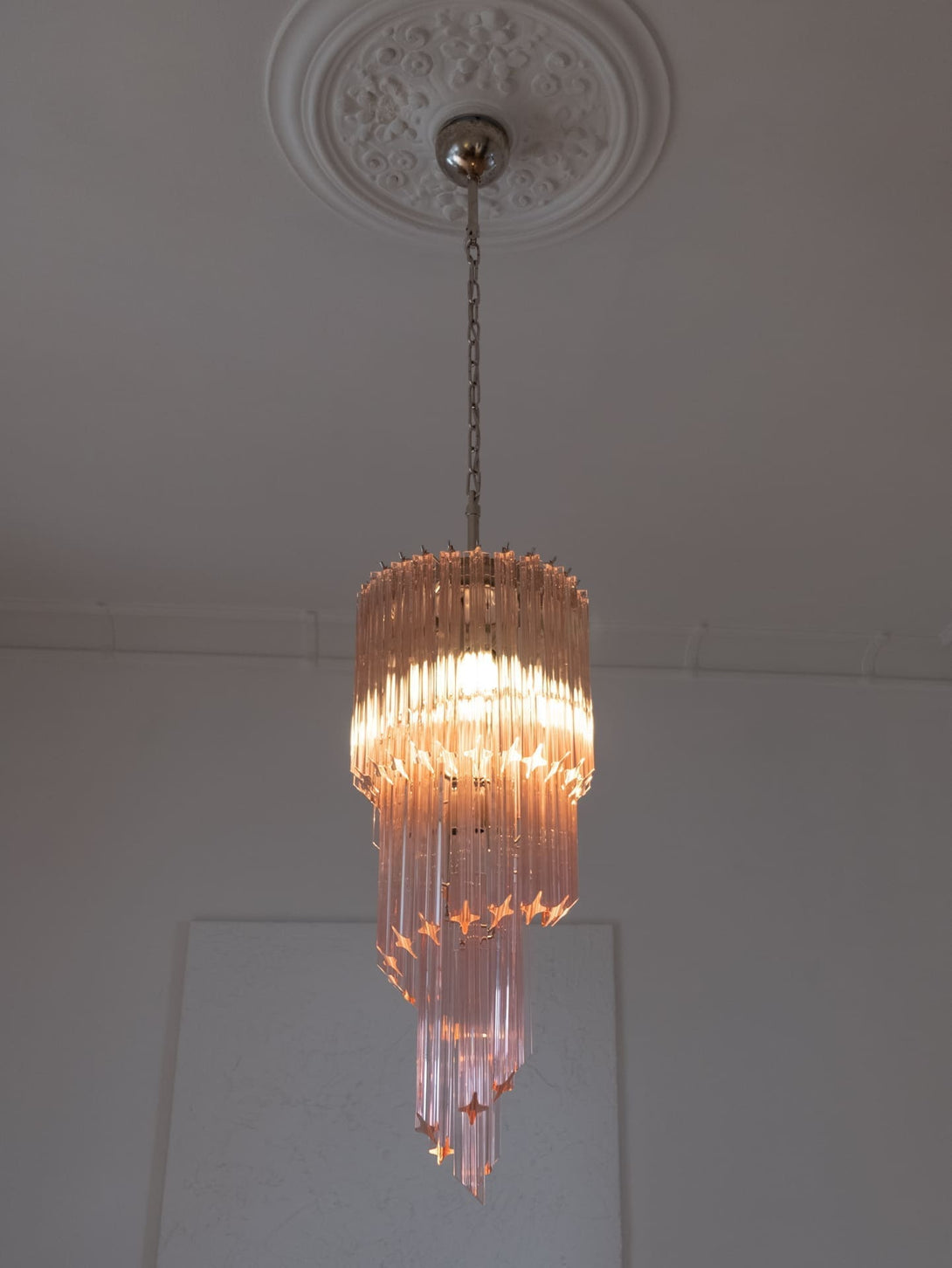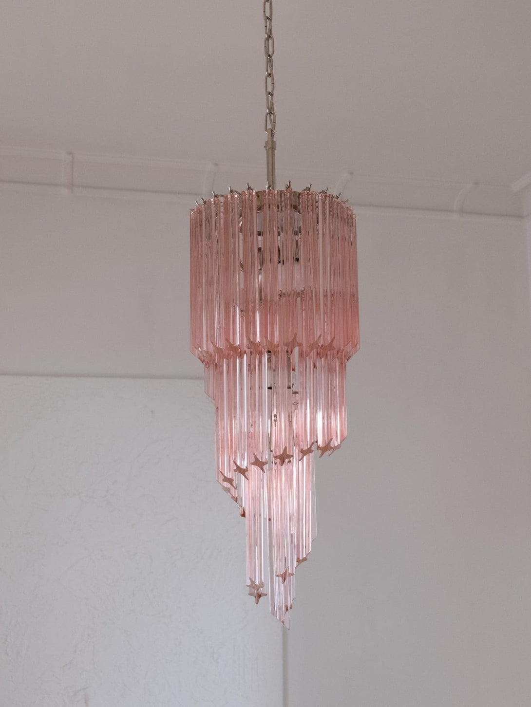 Crafted with the precision and artistry of Murano tradition, this chandelier transcends mere lighting, transforming your space into a realm of sophistication and beauty. Watch as the play of light dances through the pink prisms, casting a warm and inviting glow that adds a touch of romance to your decor. Illuminate your surroundings with the timeless elegance of this Pink Murano Spiral Chandelier.
