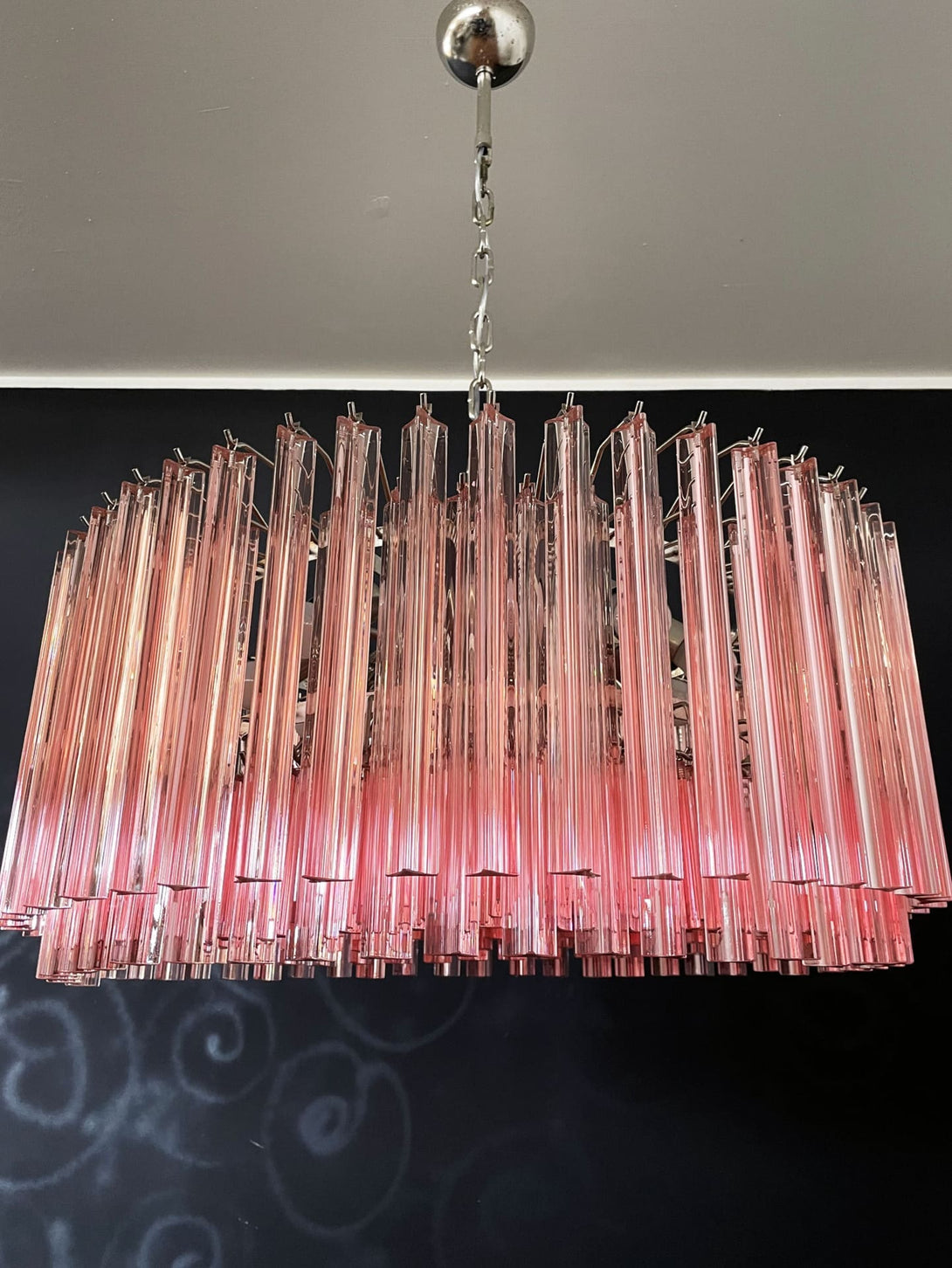 Discover a spectacular Murano chandelier, consisting of 265 pink Murano crystal prisms, beautifully encased in a metal frame. These prisms come in two different sizes, adding dimension and character to the spread of light.
