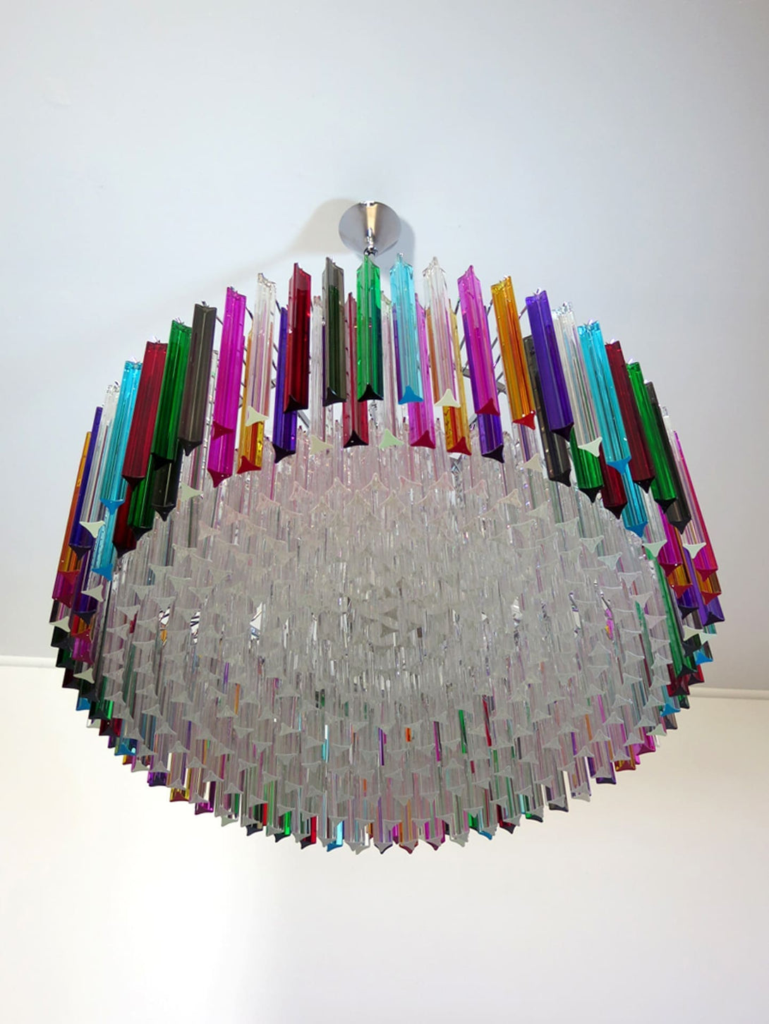Magnificent and absolutely stunning Murano chandelier made of 391 handmade multi-colored and transparent Murano crystal prisms, all sitting on a nickel metal frame. Hang it above your dining table to create a captivating focal point, or let it grace your living room, turning it into a haven of opulence and beauty. Its exquisite design and decorative impact make it an essential element in your interior design, elevating your decor to a new level of elegance.