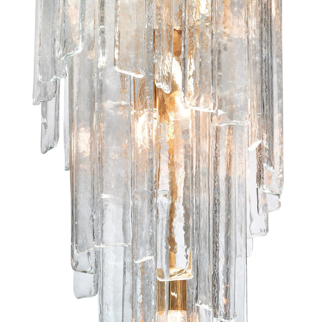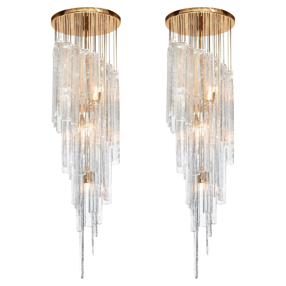 Elevate your space with this striking pair of Murano glass chandeliers, crafted in the iconic style of the Venetian glassmaker Mazzega. Featuring a cascade of textured glass blades suspended from a gilded brass plate, these Italian mid-century inspired fixtures offer timeless elegance and artisan craftsmanship. Now newly rewired for U.S. standards, they are a seamless blend of vintage charm and modern functionality — perfect for collectors, designers, and discerning homeowners alike.