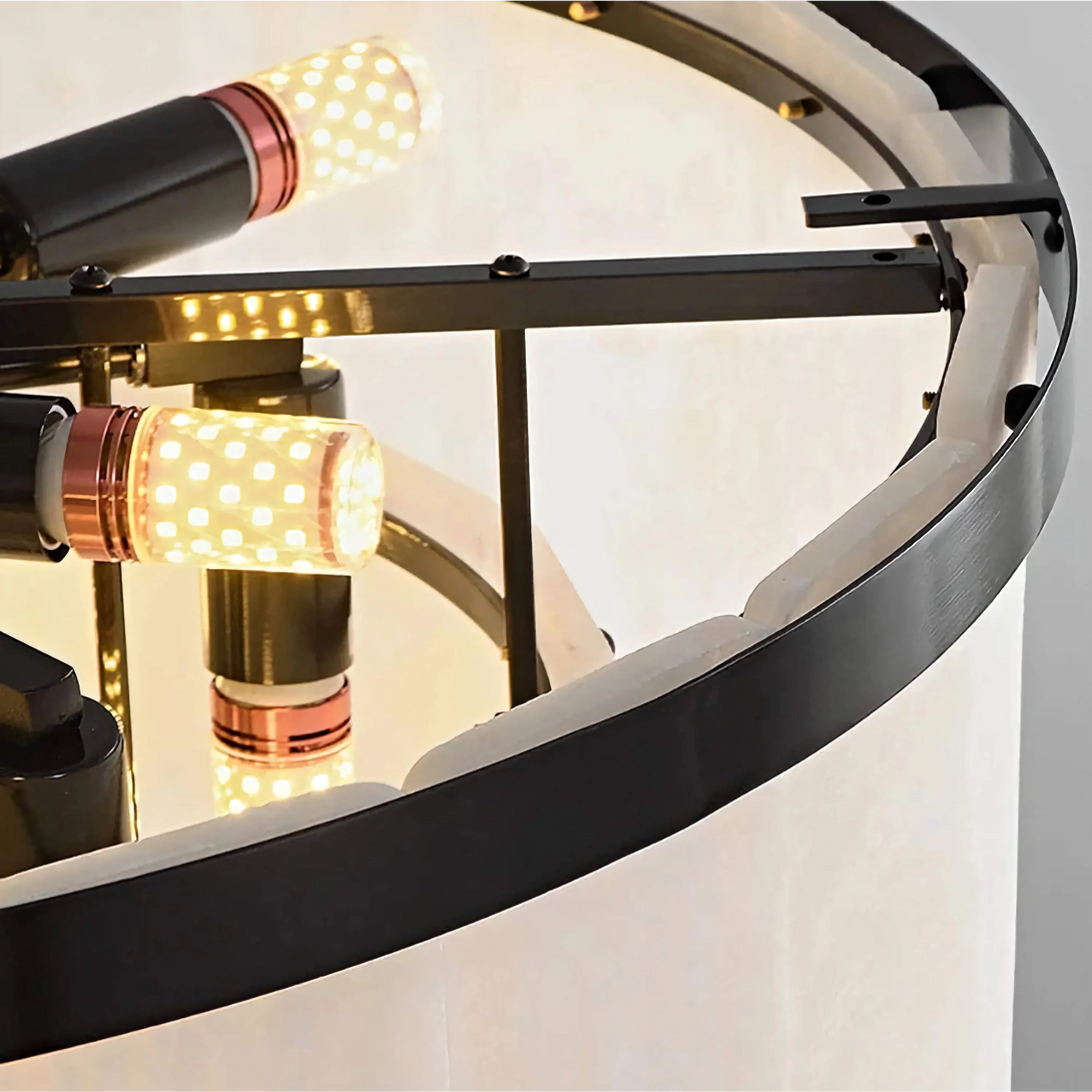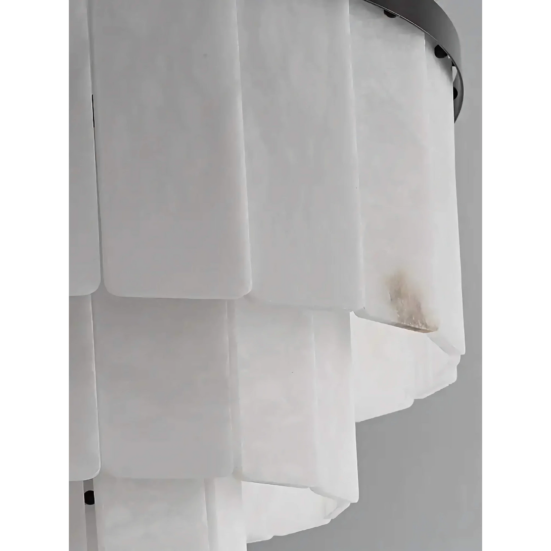 Stacked alabaster panels diffuse a soft, ambient glow within a matte black iron frame, creating an elegant centerpiece for statement kitchen islands and hospitality-grade bar counters. Chain-hung for adjustable height, this chandelier combines natural stone artistry with refined modern design.
