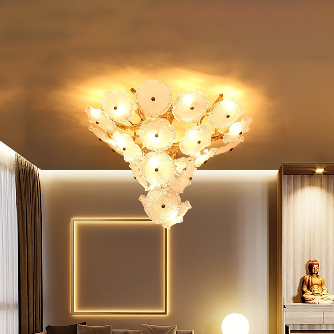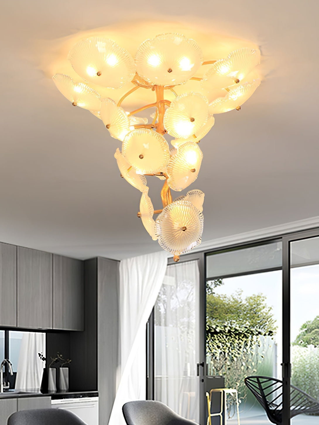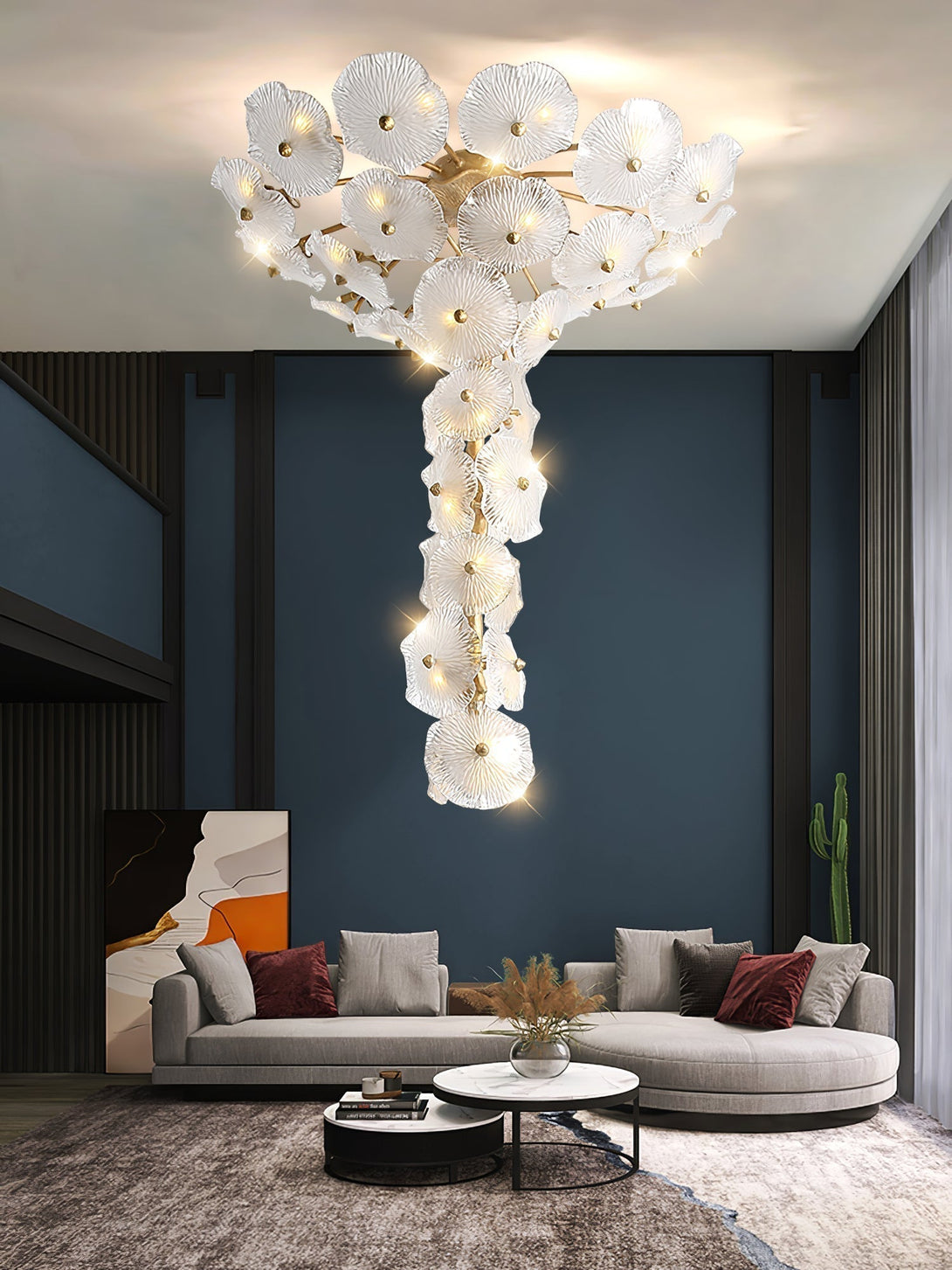 Ethereal and whimsical, the Nenufar Water Lily Chandelier stands closely connected to its direct inspiration, the aqueous nature. Beyond its particular dense structure and closed shape in some designs, it seeks an uncanny levitating sense, allowing multiple perspectives through the carefully crafted Murano glass pieces. Through the glass specifications, the Nenufar Water Lily Chandelier achieves diffuse lighting providing an alluring romantic sense, reminiscent of the natural beauty of nature. Ideal for delicate interiors of vertical architecture.