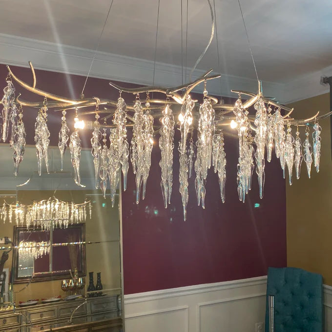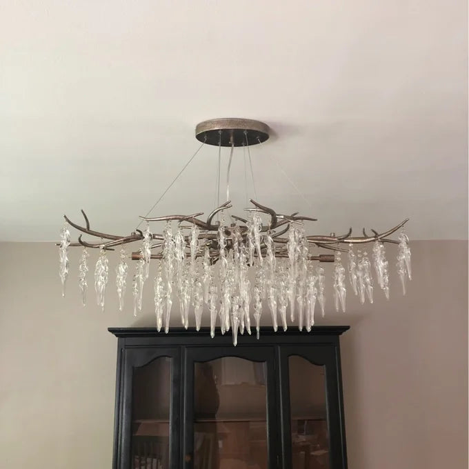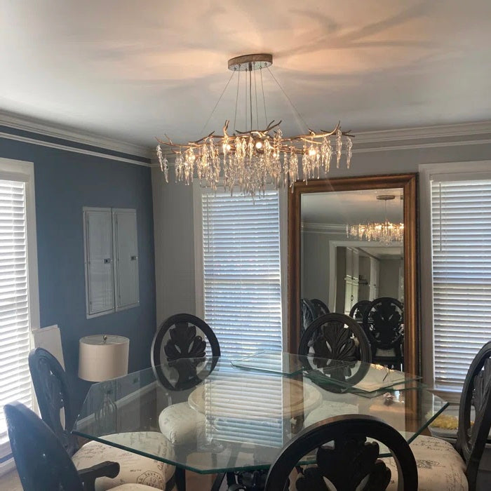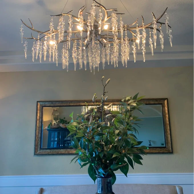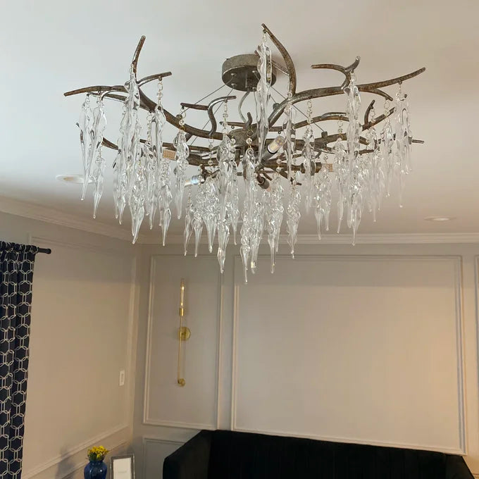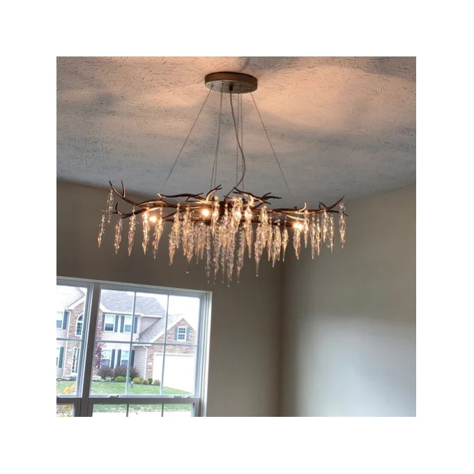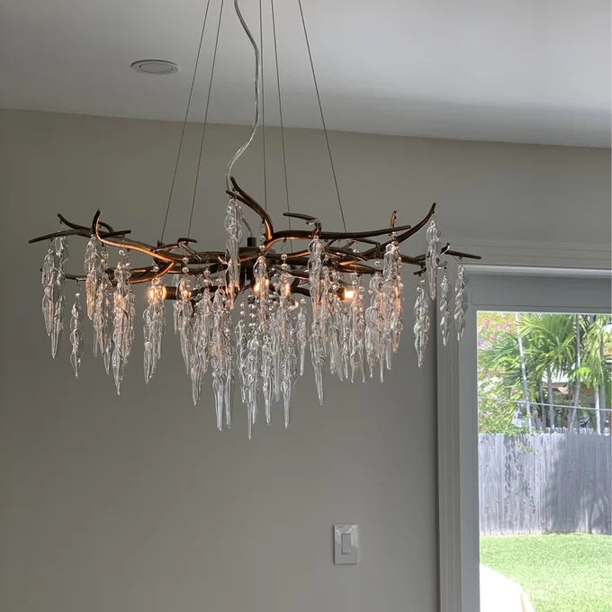 With its striking blend of elegant and rustic vibes, this chandelier makes a statement wherever it hangs. Crafted from metal, the branch-like structure is finished in a warm bronze hue with speckled silver undertones throughout. This fixture shows off icicle glass strands topped with crystal beads for a glistening display of light. We love the intentional distressing throughout, which leans into this piece's old world charm. Best of all, it boasts an adjustable height and is compatible with both sloped ceilings and dimmer switches. Bulbs are included to save you a trip to the hardware store.