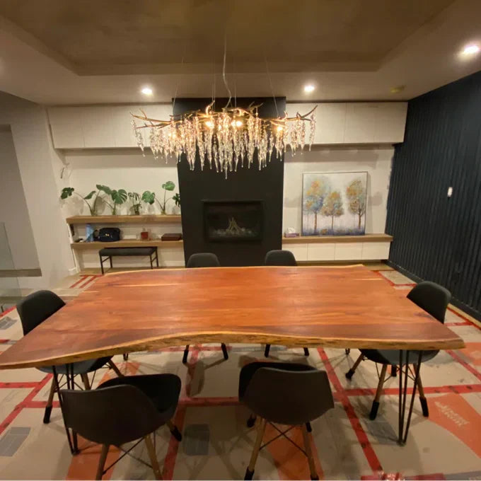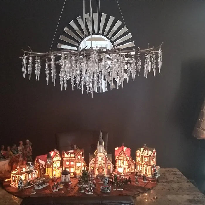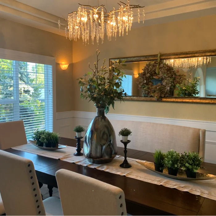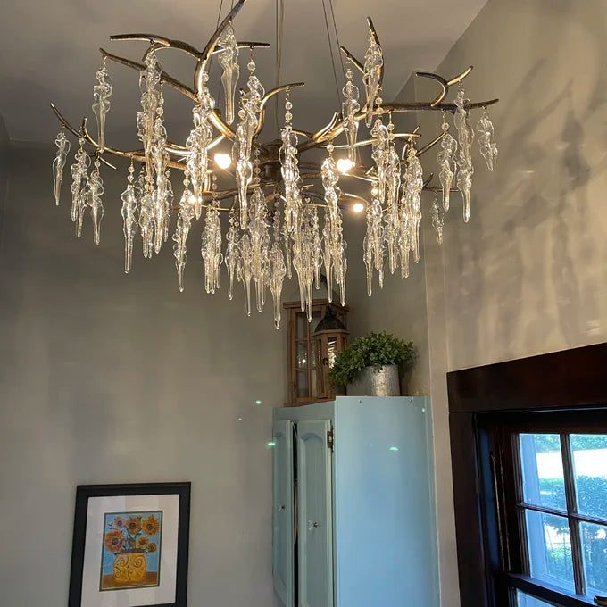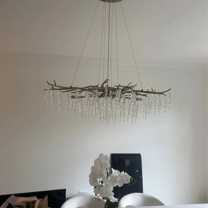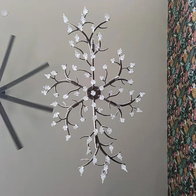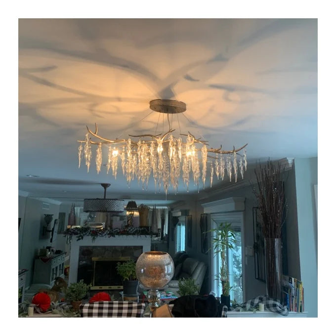 With its striking blend of elegant and rustic vibes, this chandelier makes a statement wherever it hangs. Crafted from metal, the branch-like structure is finished in a warm bronze hue with speckled silver undertones throughout. This fixture shows off icicle glass strands topped with crystal beads for a glistening display of light. We love the intentional distressing throughout, which leans into this piece's old world charm. Best of all, it boasts an adjustable height and is compatible with both sloped ceilings and dimmer switches. Bulbs are included to save you a trip to the hardware store.