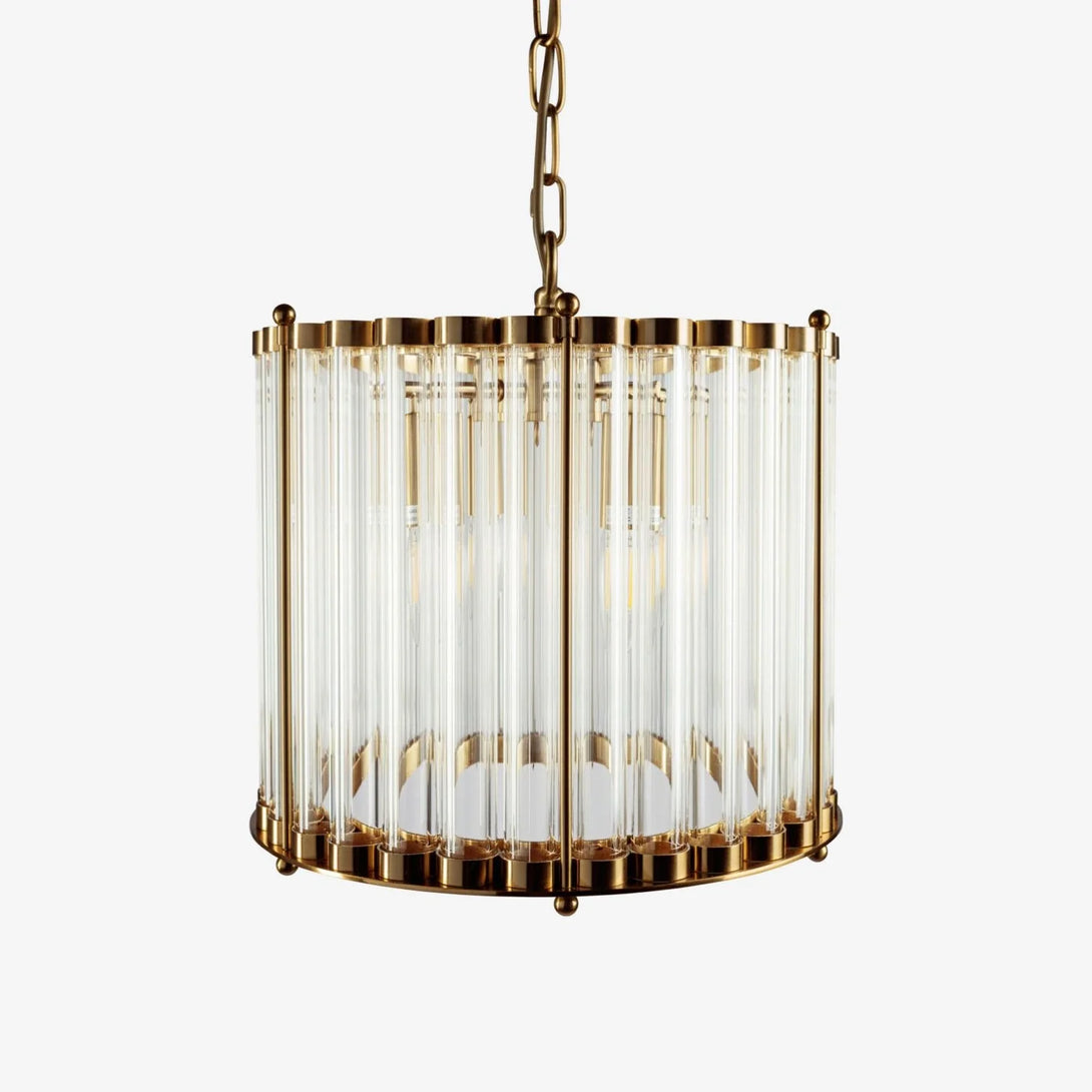 The elegant Monza drum chandelier showcases clear glass tubes housed within a sleek cylindrical nickel frame. Ideal for smaller spaces or arranged in clusters above a dining table, bar, or kitchen island.
