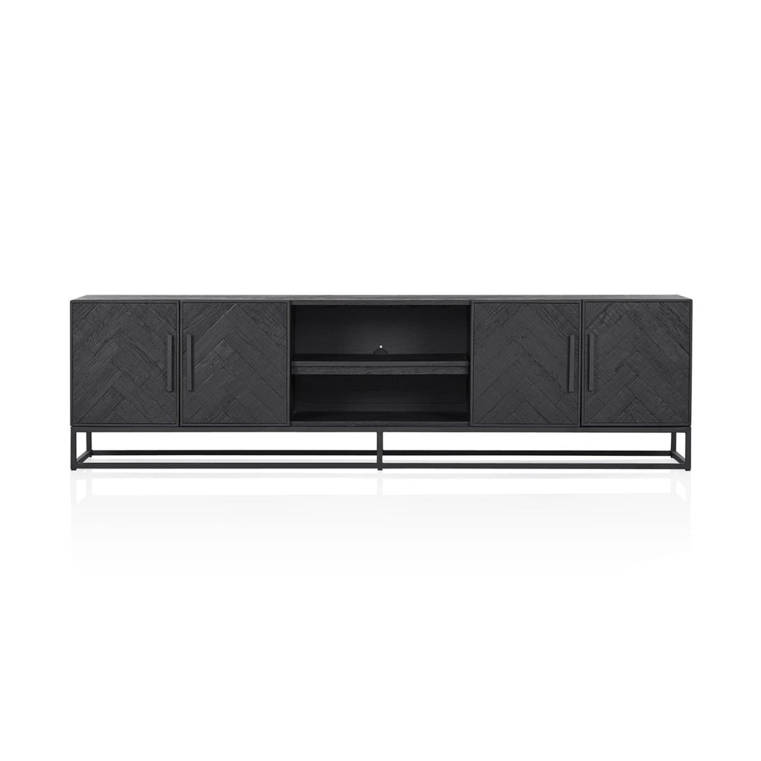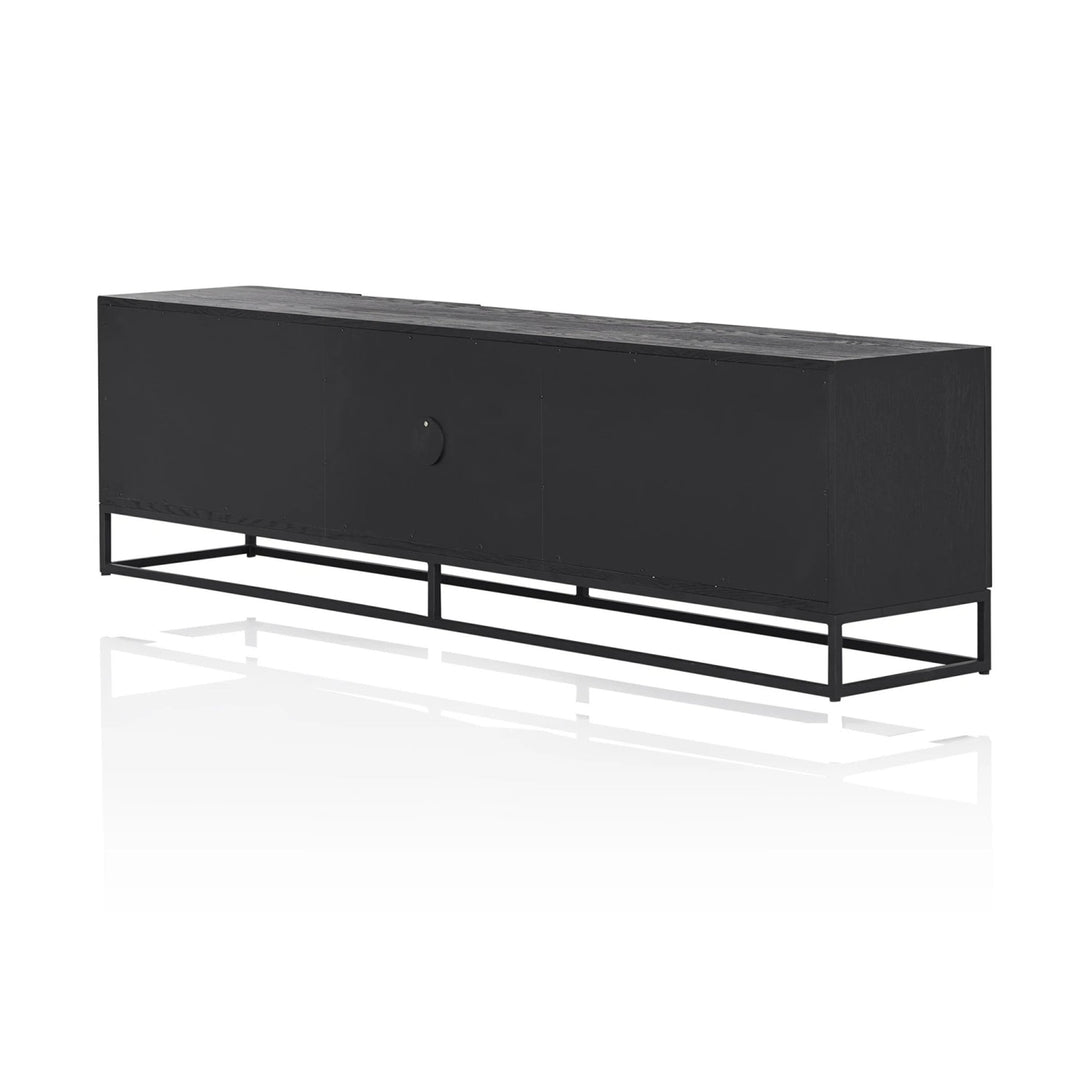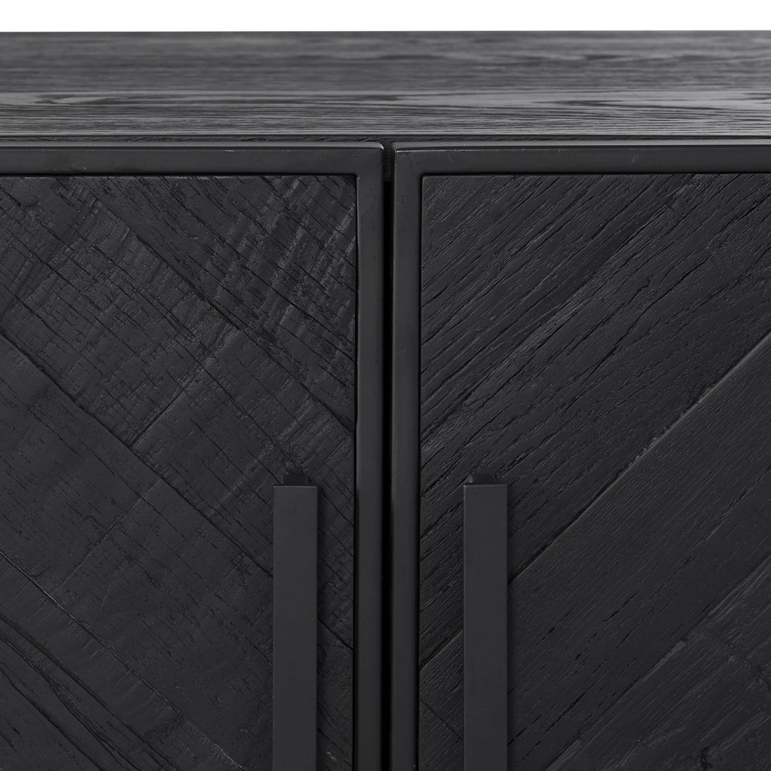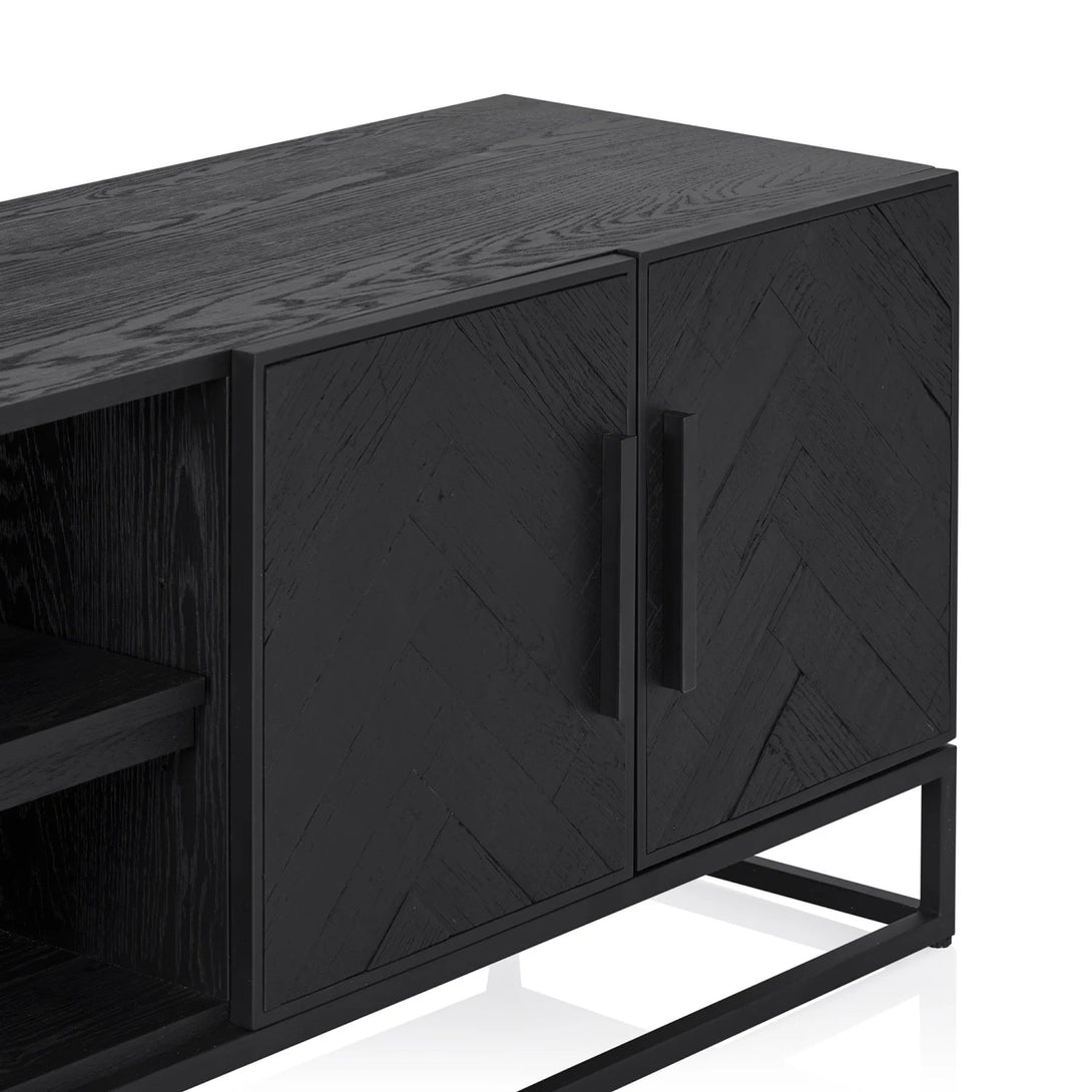 Rustic modern style entertainment unit with handcrafted parquet wood inlay stained in black with metal frame.|The Odessa Entertainment Console with handcrafted parquetry pattern inlay exudes a natural style ideal for today's living spaces. The timber has a black stained distressed look combined with a blackened metal frame. Equipped with two doors and two open shelves to accommodate and conceal your audio-visual equipment. Curated for the sophisticated home the Gramercy collection is inspired by interiors of chic Parisian homes. Handcrafted from timber with elegant metal accents the colour palette lends a refined modern edge to classic forms.