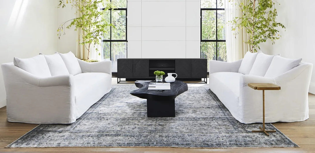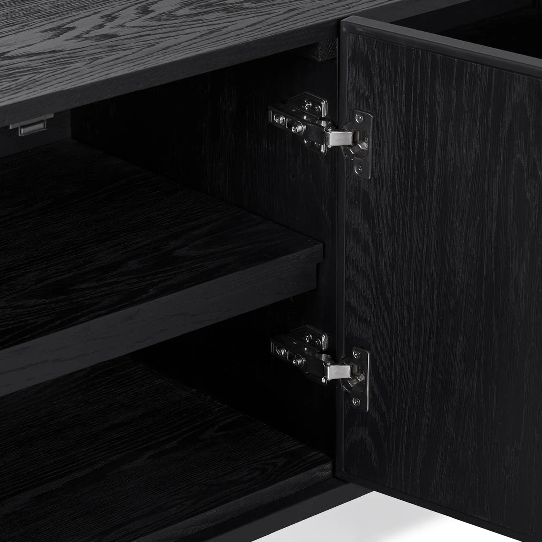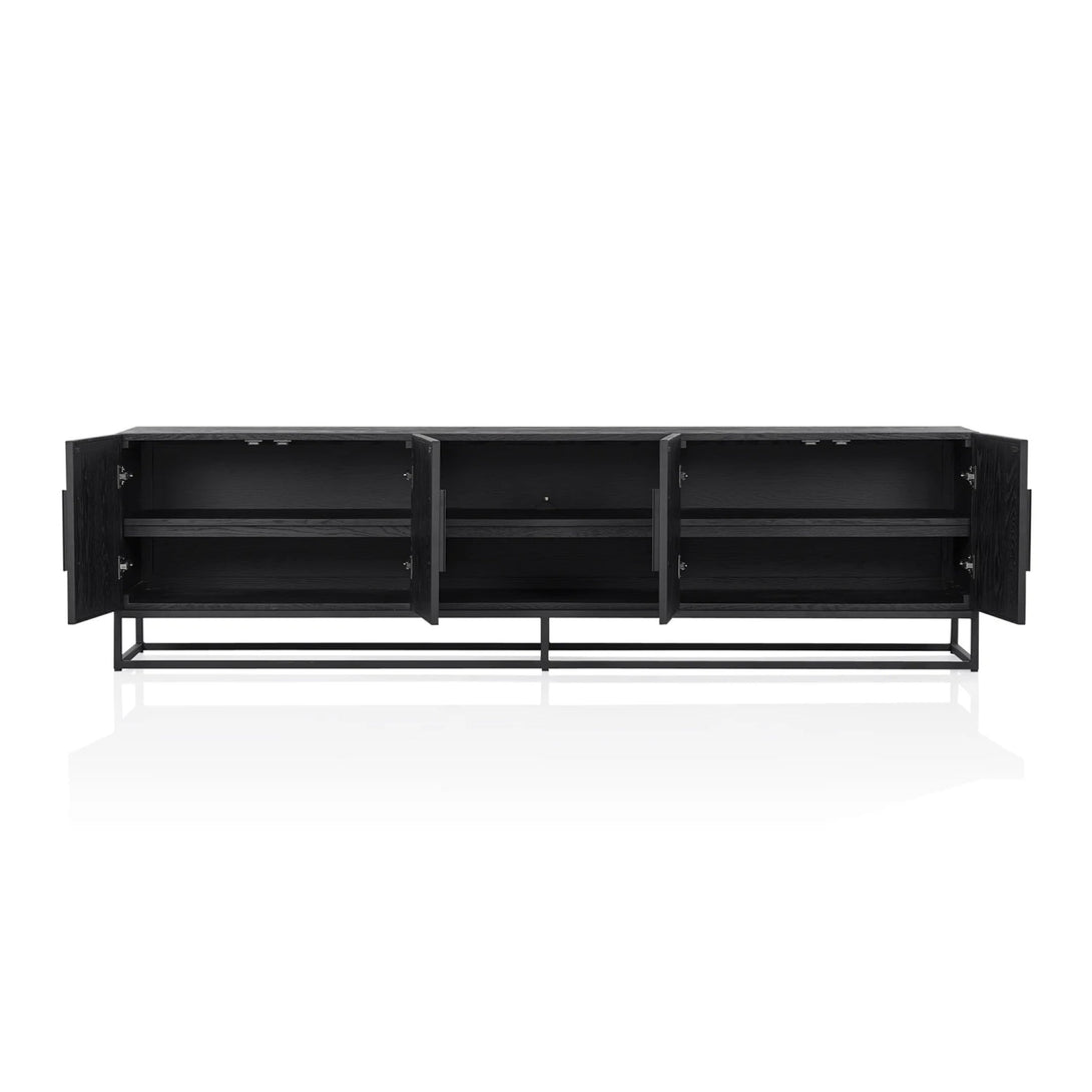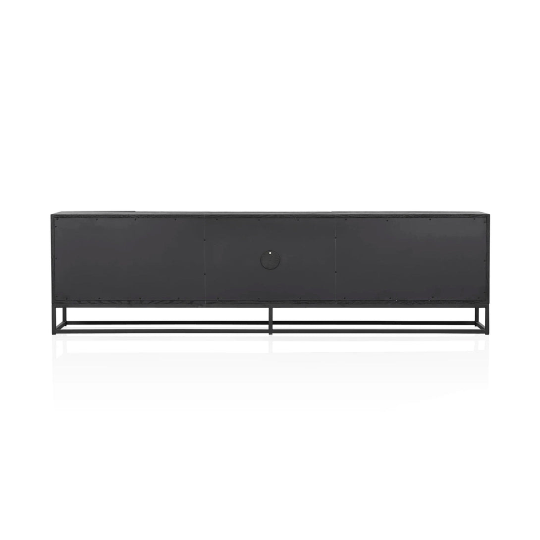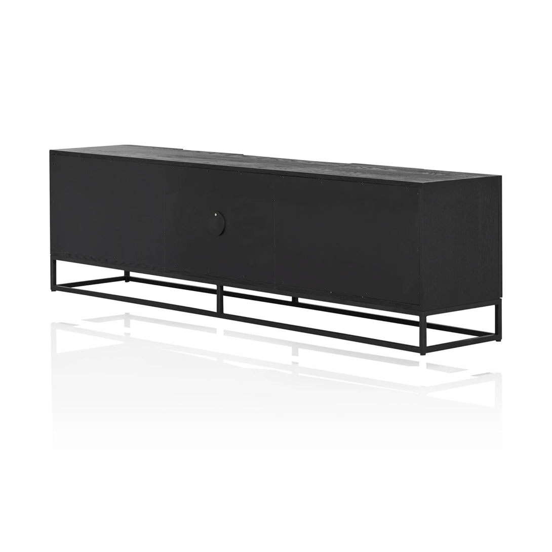 Rustic modern style entertainment unit with handcrafted parquet wood inlay stained in black with metal frame.|The Odessa Entertainment Console with handcrafted parquetry pattern inlay exudes a natural style ideal for today's living spaces. The timber has a black stained distressed look combined with a blackened metal frame. Equipped with two doors and two open shelves to accommodate and conceal your audio-visual equipment. Curated for the sophisticated home the Gramercy collection is inspired by interiors of chic Parisian homes. Handcrafted from timber with elegant metal accents the colour palette lends a refined modern edge to classic forms.