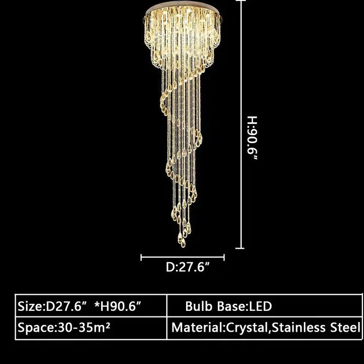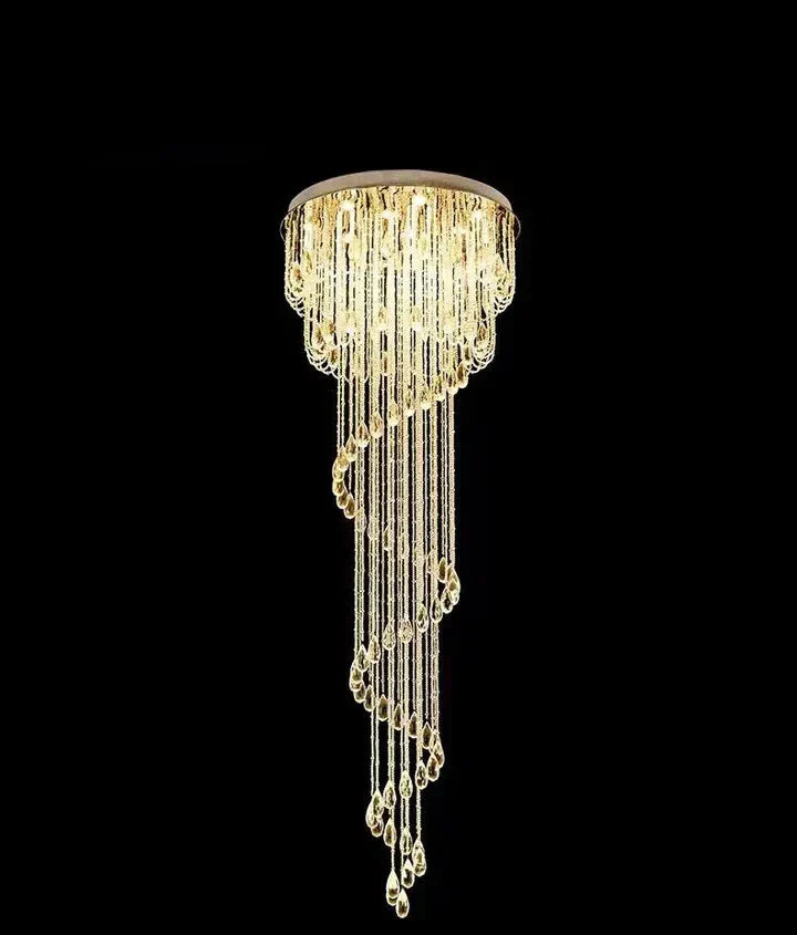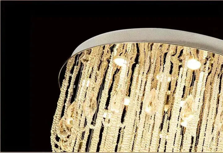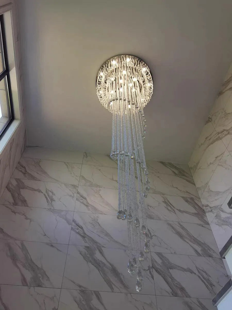 This chandelier features a mirrored stainless steel chassis with a high quality crystal pendant and crystal pineapple beads. With LED spotlights inside, this light can decorate duplexes, two-storey buildings, staircases of large houses, grand foyers, corridors and entrances.