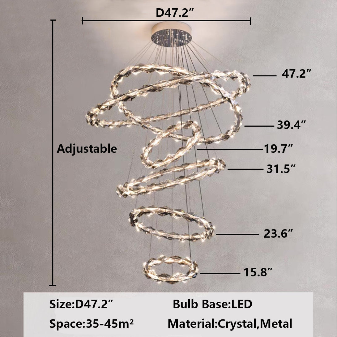 Modern light luxury design aesthetics, adding gray crystals to the original clear crystal, adding a sense of luxury and layering of this lamp, different sizes of rings staggered, or neatly arranged, or rotating, pulling up the sense of use of space, this lamp is simple and advanced, very suitable for decorating a large space, adding a sense of happiness in the home.