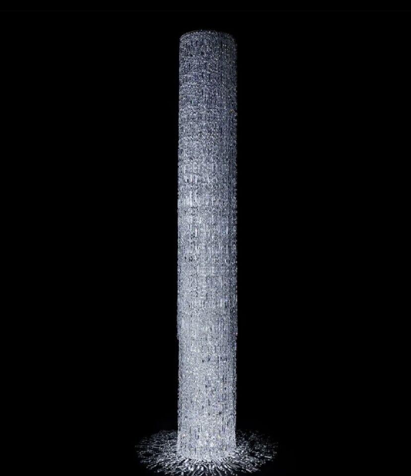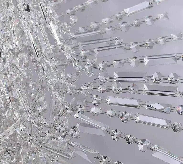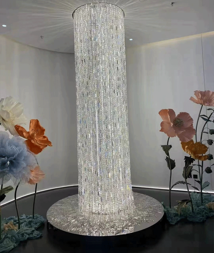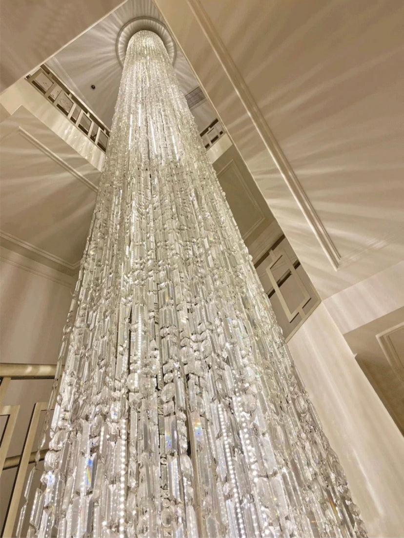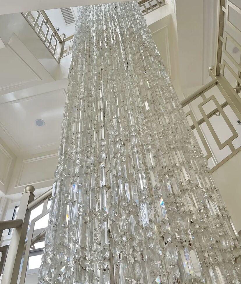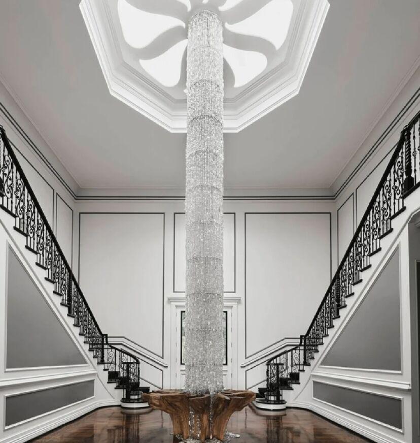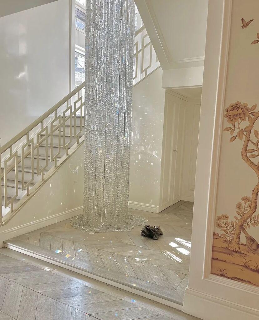 It's like a waterfall cascading down, with dazzling crystals shimmering silver and pouring down from the ceiling. This Icicle Crystal Chandelier is a stunning work of art custom made for the staircase and is absolutely the most unparalleled in its beauty.