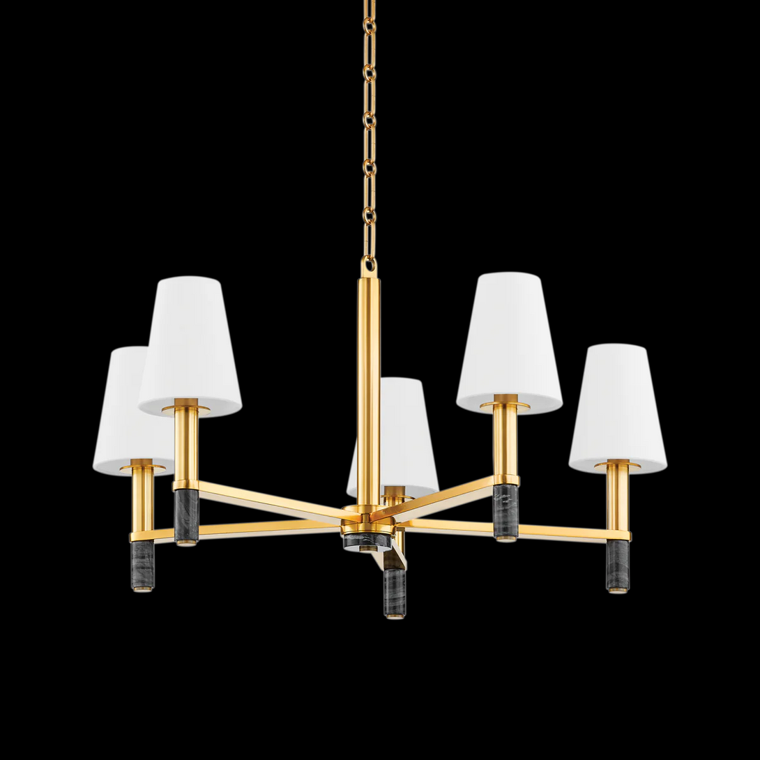 Merging past and present, Montreal features contemporary clean lines and the striking appeal ofNero Modera marble. Each natural stone candle sleeve is topped with a tapered white linenshade and complemented by a warm Aged Brass finish. Available as a sconce or chandelier intwo sizes, Montreal embodies understated luxury.*Due to the one-of-a-kind nature of the medium, exact colors and patterns may vary slightly fromthe image shown.