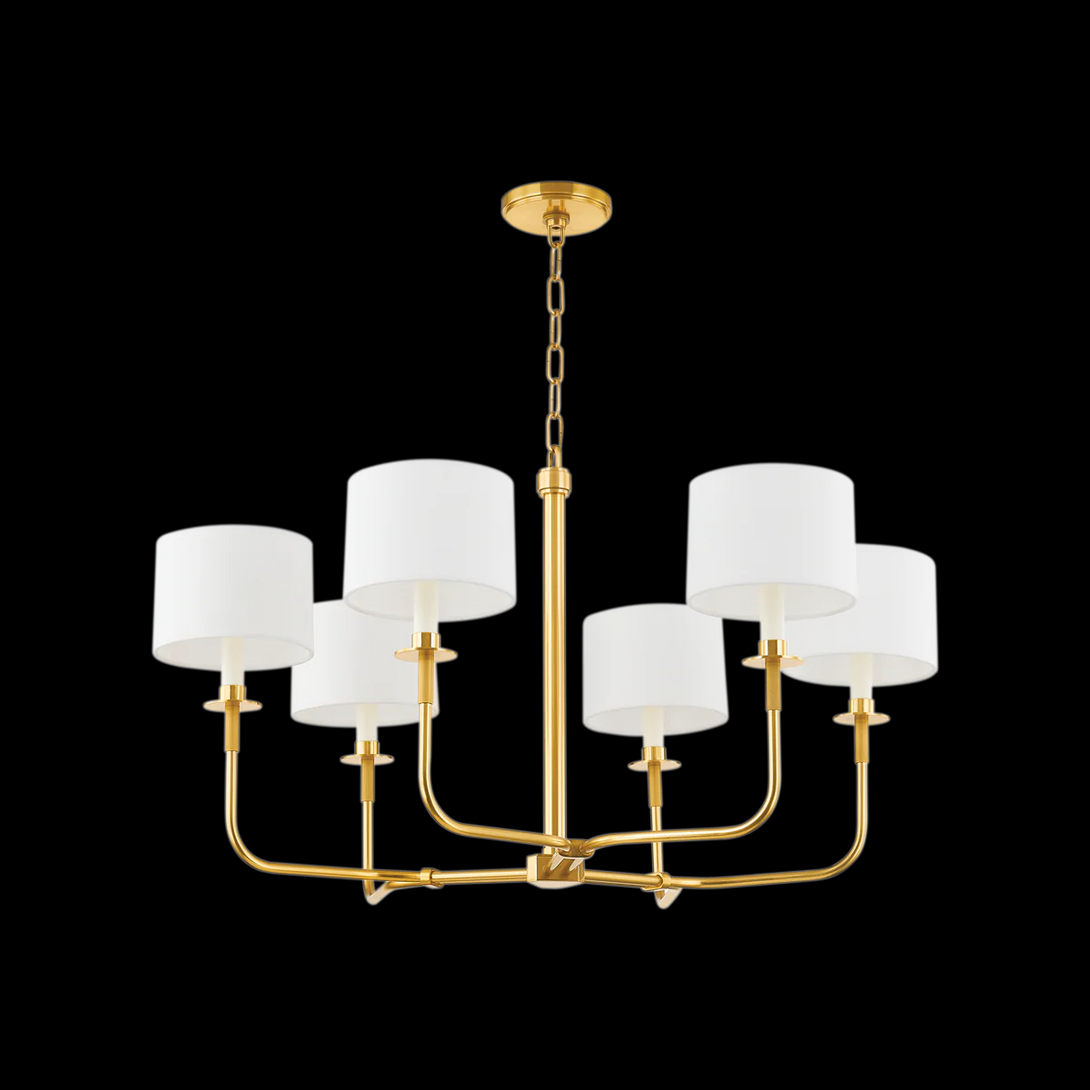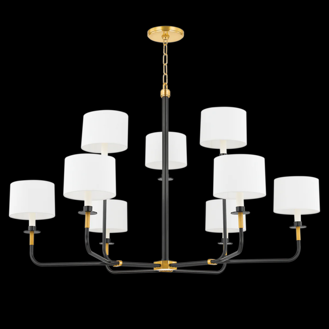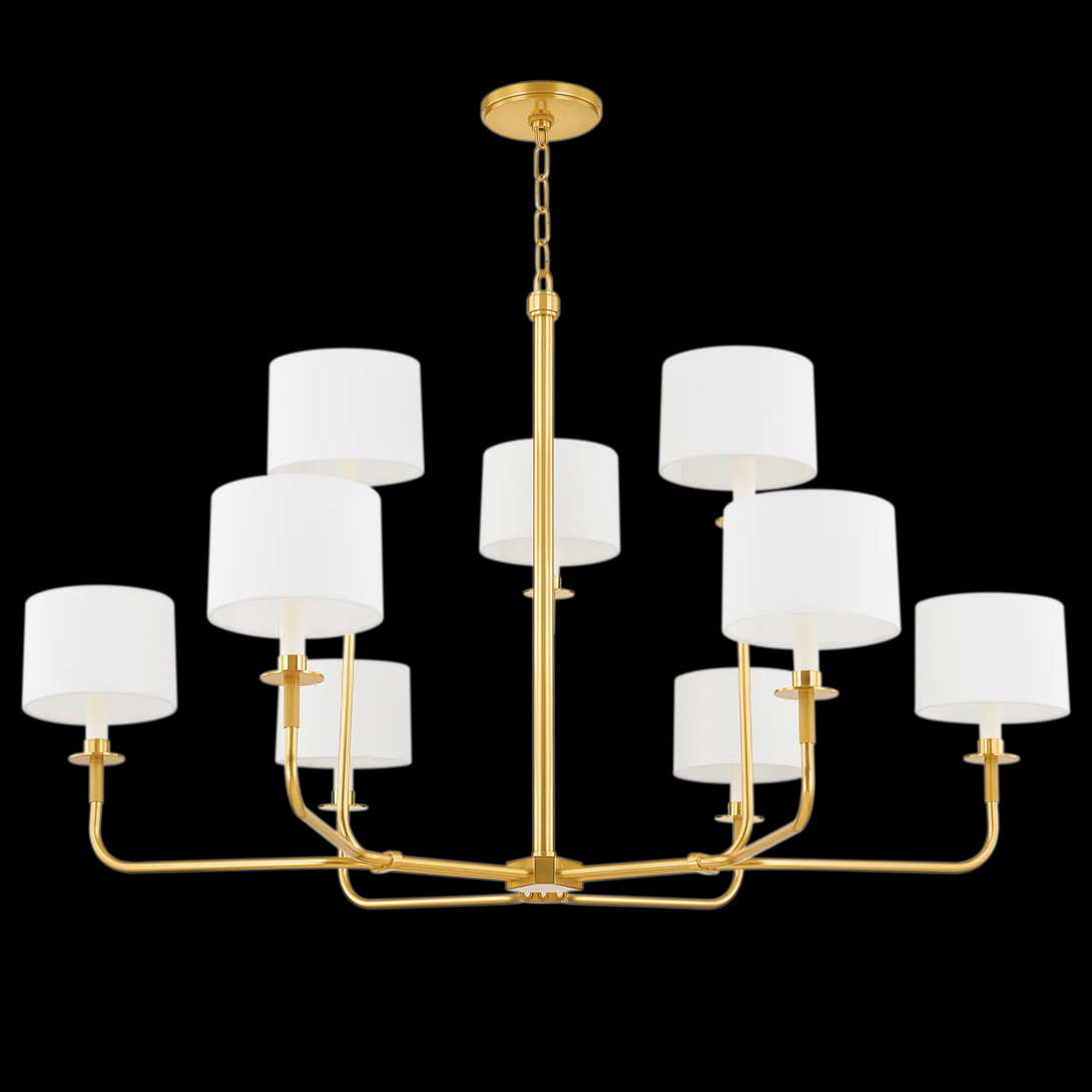 As either a chandelier or sconce, Paramus takes traditional elements, like arm and shadeshape, and updates them by playing with scale. Elongated arms extend upwards to supportcandle sleeves topped with white linen drum shades. Available as a chandelier in two sizes oras a wall sconce, Paramus comes with the option of an Aged Brass or combination Old Bronzeand Aged Brass finish. In its largest chandelier rendition, nine arms are staggered at varyingheights to create a standout piece.