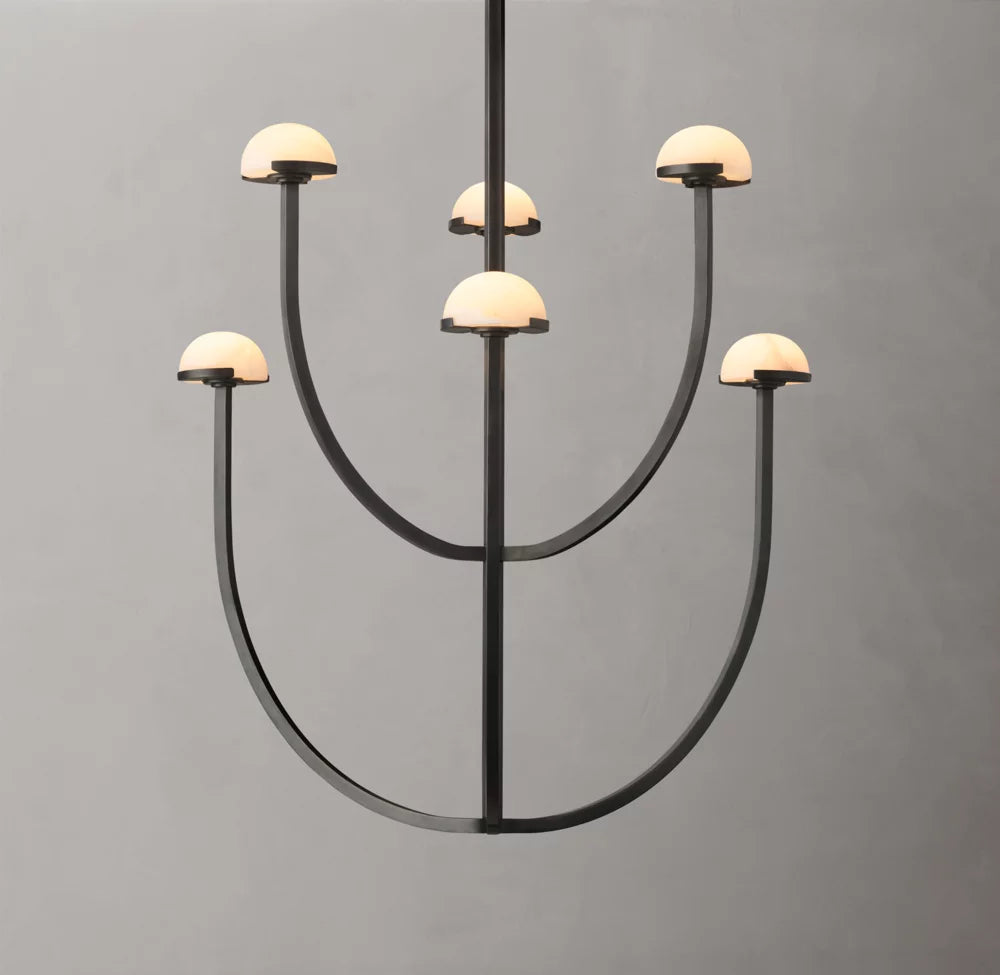 Minimalist in design yet maximalist in effect, our lighting collection was inspired by a midcentury Italian silhouette. Metal armatures reminiscent of architectural tracery support a constellation of dome-shaped, translucent alabaster shades that highlight the stone's natural veining and coloration. The sculptural form emits a warm, filtered glow.