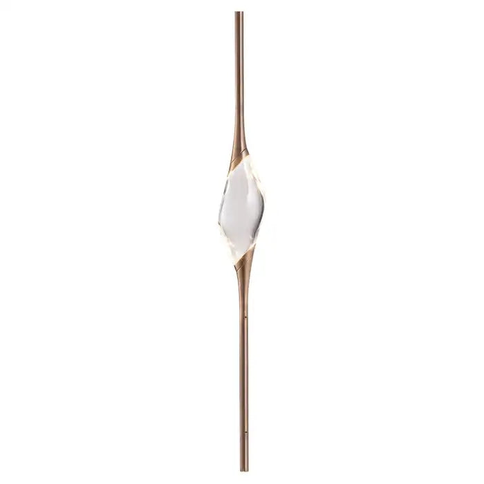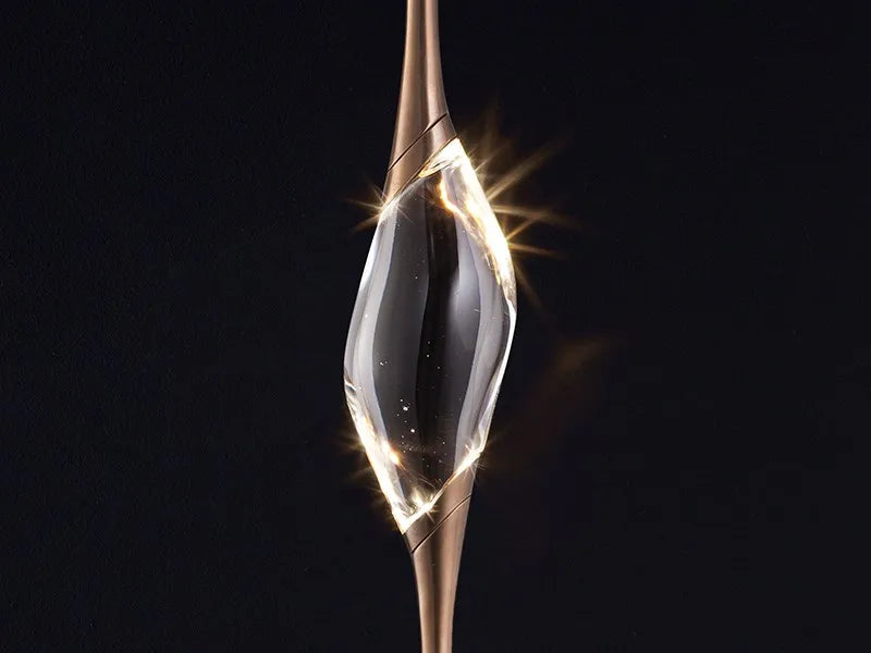 Il Pezzo 12 is a female figure suspended in the air, carrying in her womb the light. It’s nimble, refined, addictive. The solid crystal, illuminated by LEDs, creates suggestive refractions and it’s suspended between brass stems finished in contrasting colours.