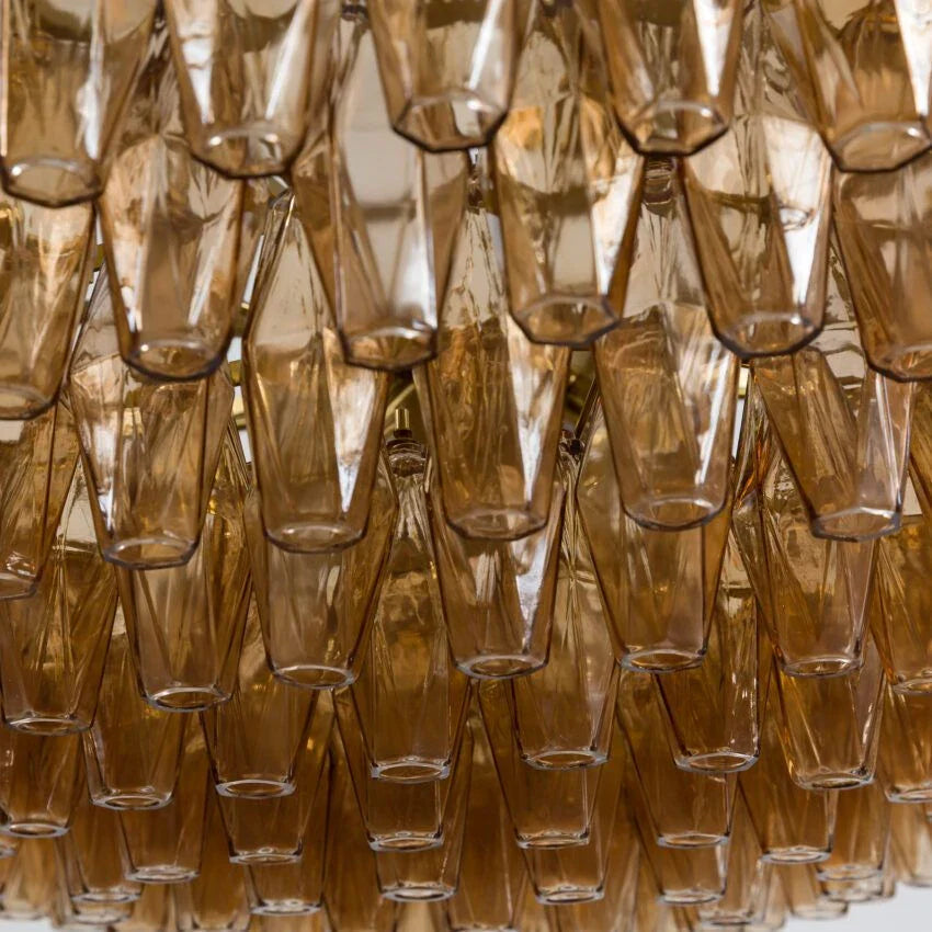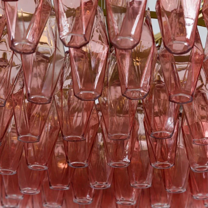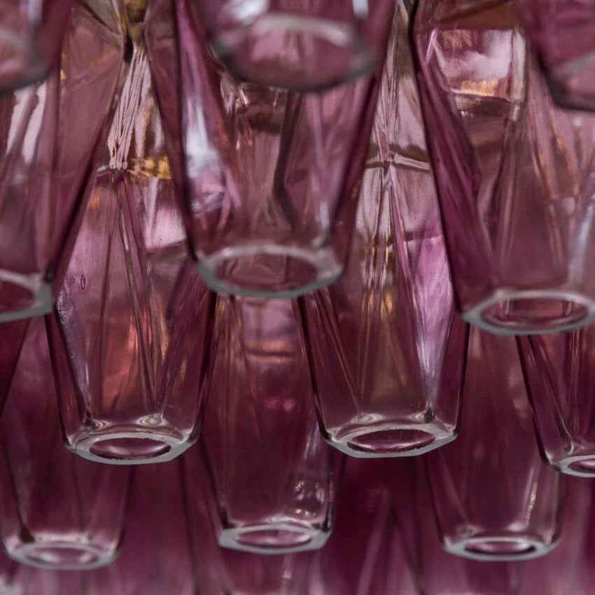 The Sorrento tiered chandelier is a breathtaking, vintage-style lighting masterpiece, offered in four stunning finishes: Pink, Amber, Smoked Glass, and Clear Glass. This captivating design features layers of intricately shaped colored glass polyhedrons, each meticulously secured to an elegant brass-finished frame, blending timeless charm with modern sophistication.