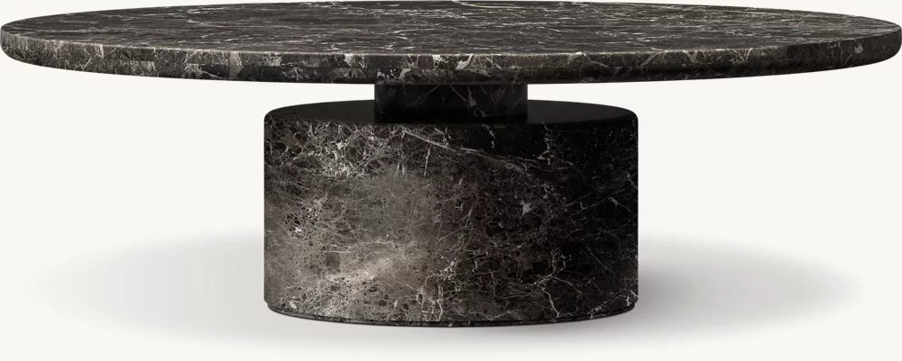 Evoking the expressive designs of 1970s postmodernism, the Ponti coffee table combines a bold geometric silhouette with the beauty of carved stone. Grounded in a pedestal base that supports a slender top, the dynamic form is marked by a cinched midsection. Tonal variations and rich vein patterning make each piece one of a kind.