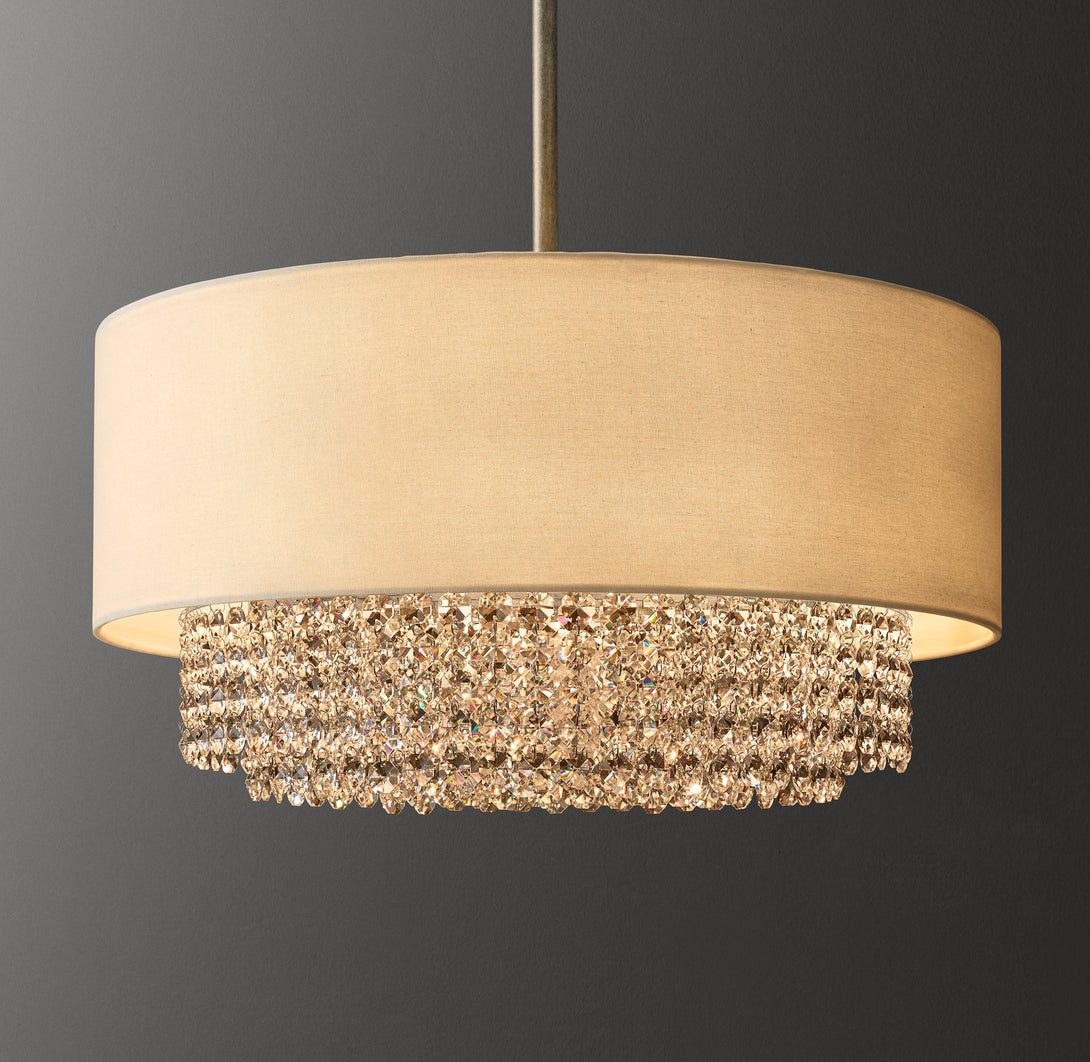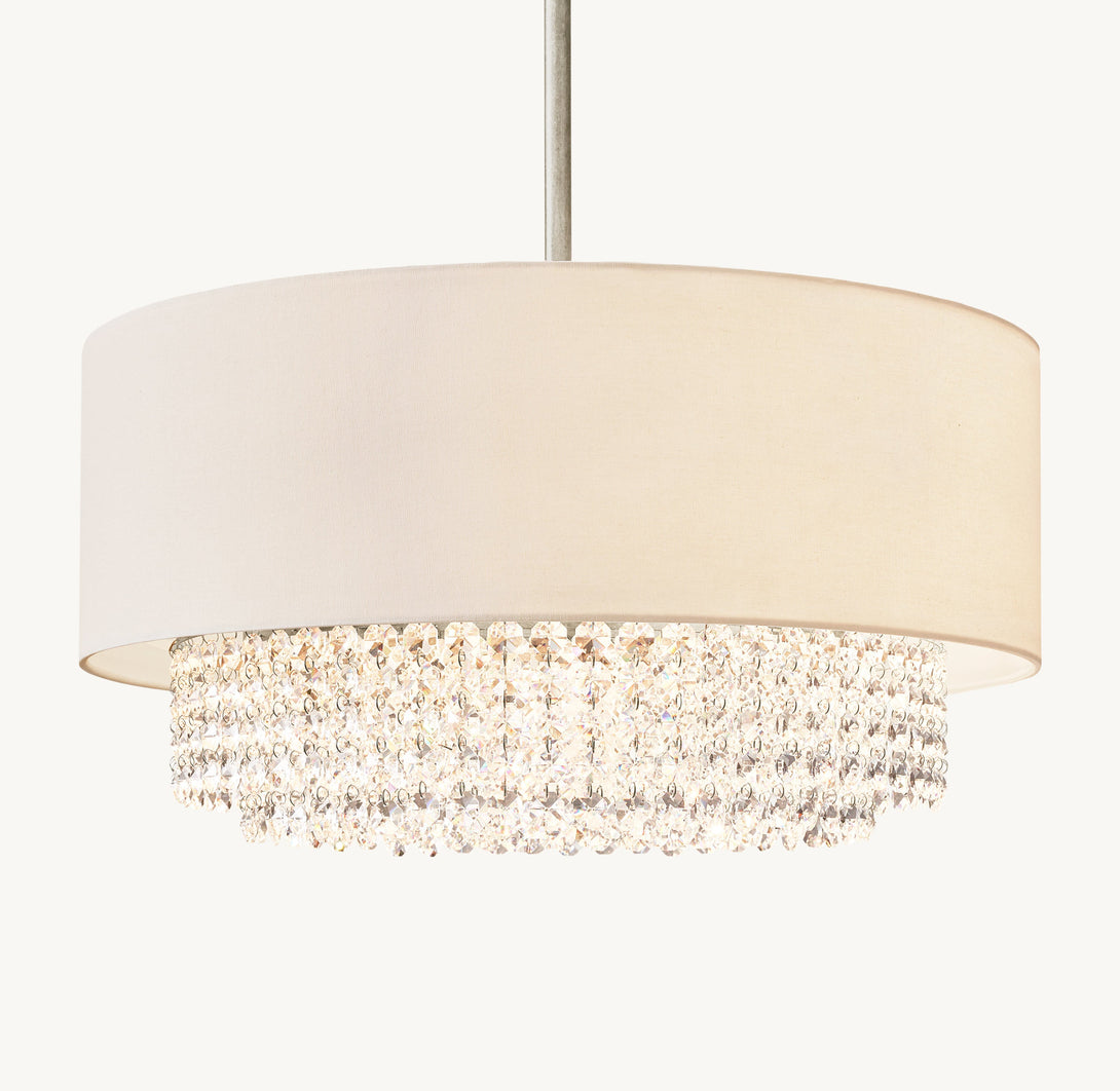 - Fitted with an ivory linen-cotton drum shade and tiers of faceted rectangular and round K9 glass crystal beads