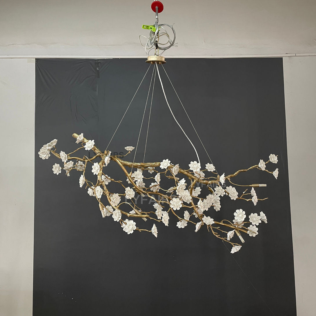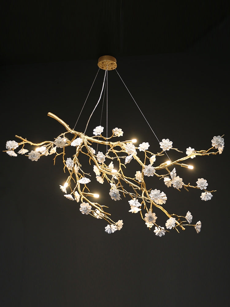This artistic chandelier is made of brass and ceramic materials. Its shape is full of creativity and novelty. The branches made of brass material have a delicate texture and the simulated branches have many blooming plum blossoms. The white flowers are made of ceramic, flawlessly white, full of fairy-tale romance, exquisite and elegant. This lamp not only has a chandelier can be used in the dining room, living room, bedroom and other places, can definitely make your guests shine.