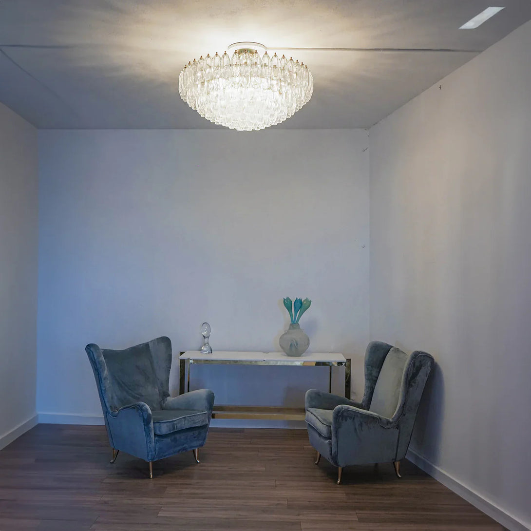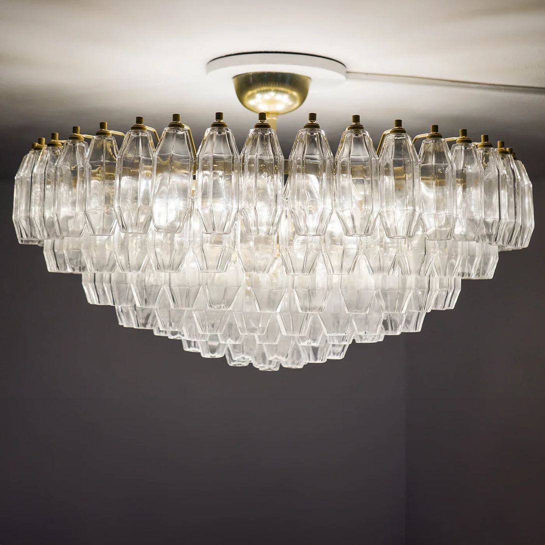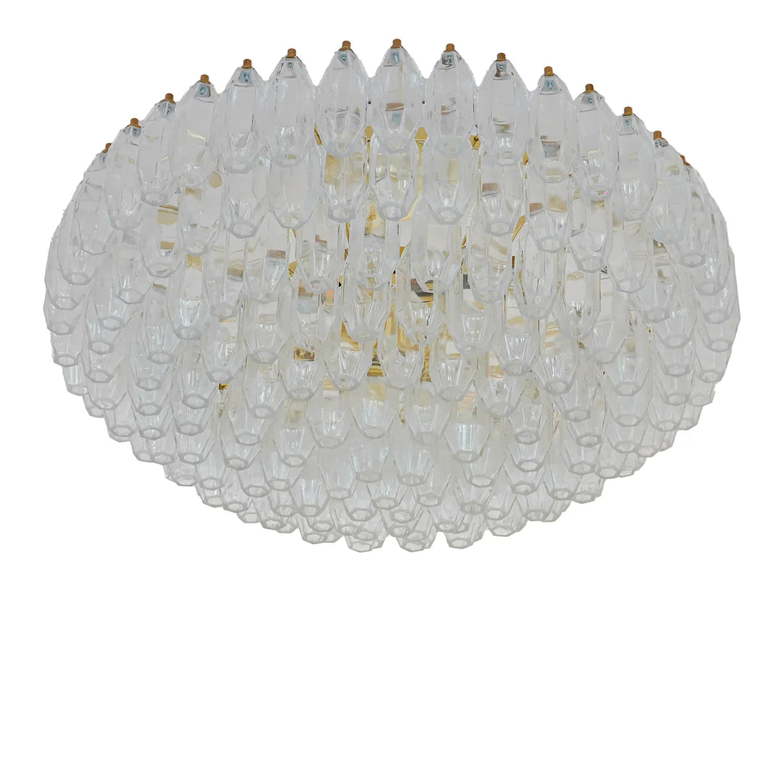 A triumph of 169 faceted pencil-shaped glass elements all carefully mouth-blown captures this chandelier's luxurious and ethereal allure. A double magnifying lens effect allows for the glass pieces to homogeneously diffuse the glow and conceal the hardware frame for a stupefying illusion of floating lights.
