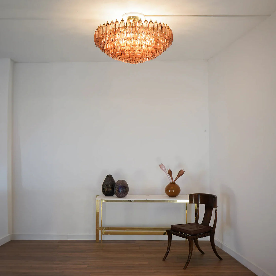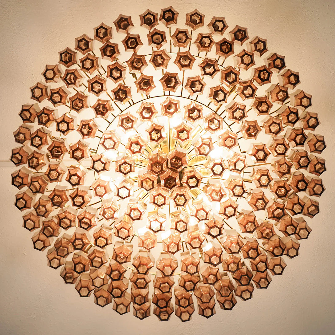 A splendid cluster of 169 mouth-blown amber glass elements shaped like pencils imbues this chandelier with a luxurious charm. Thanks to a special double magnifying lens design, each glass element contributes to the clever concealing of the brass hardware structure while offering a perfectly homogeneous and sophisticated light output.