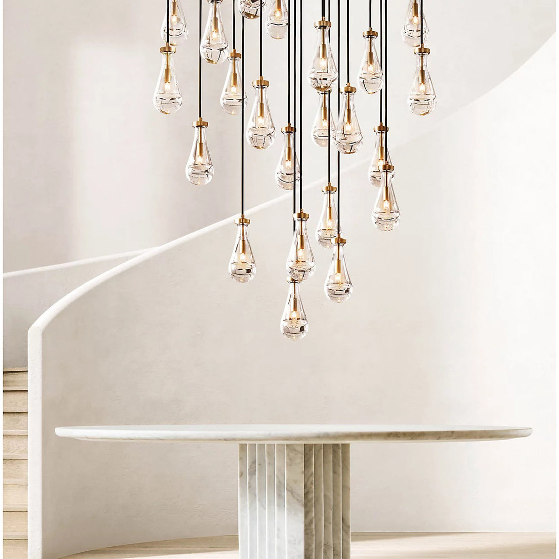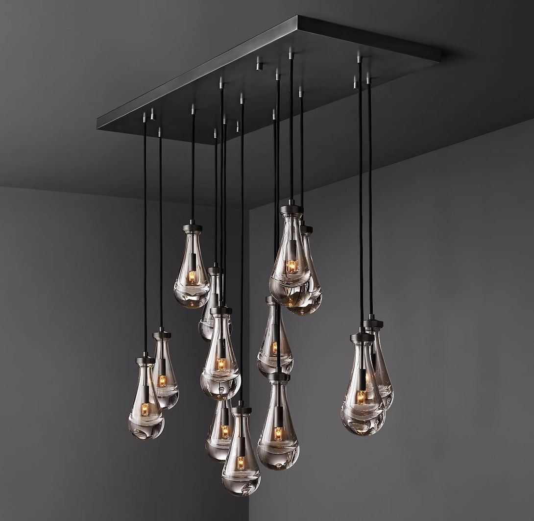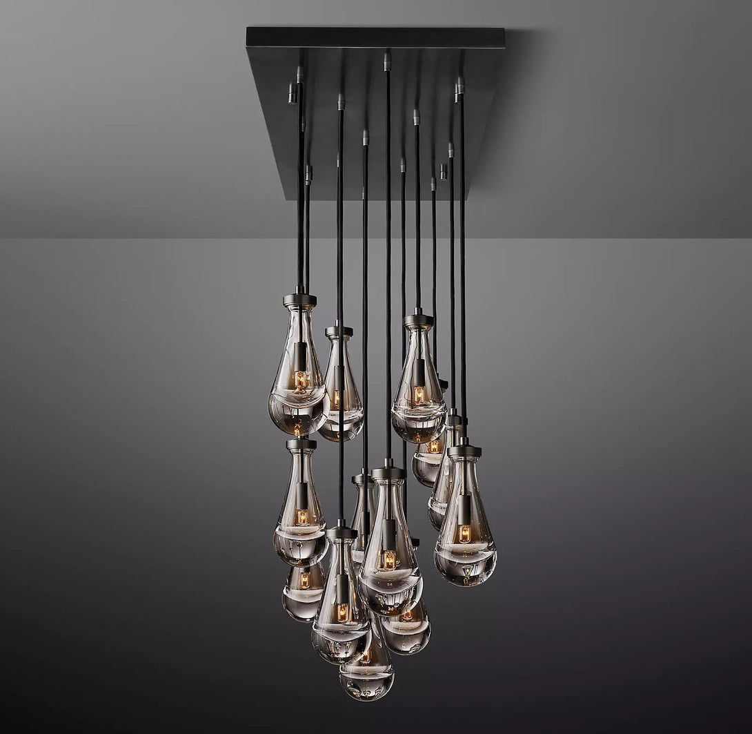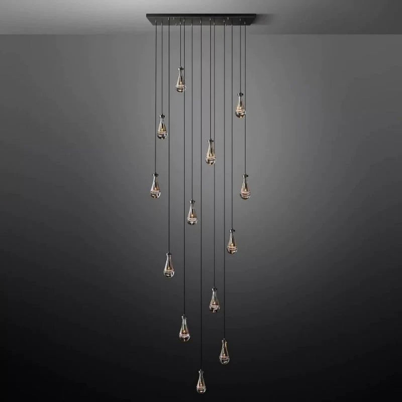 Raindrop Chandelier engages the viewer in an ever-changing pattern of expansion and compression - much like the rhythm of a rainstorm itself. Suspended on slender black ropes, blown glass drops wrap around the bulbs - creating the illusion of underwater illumination - and cast glowing ripples that wash over the ceiling and walls.