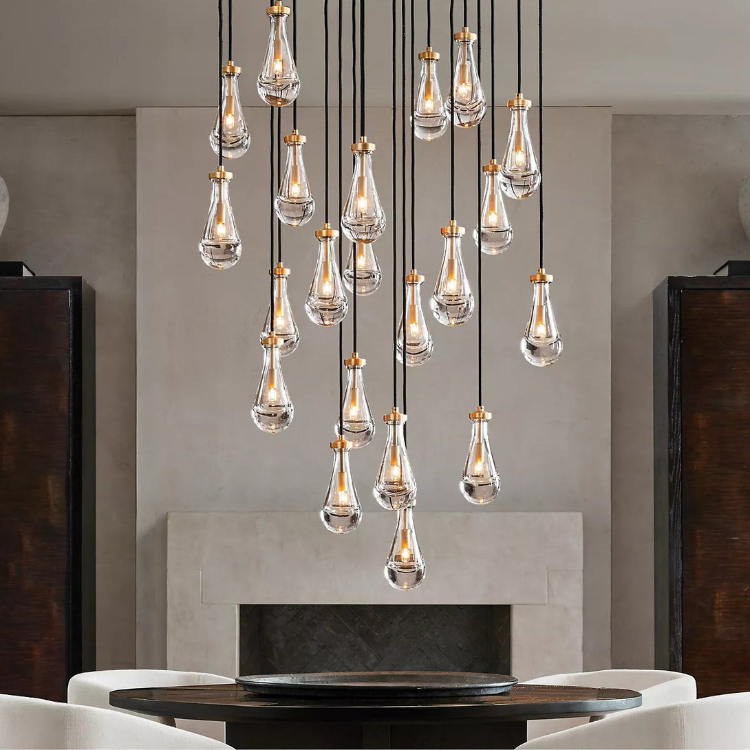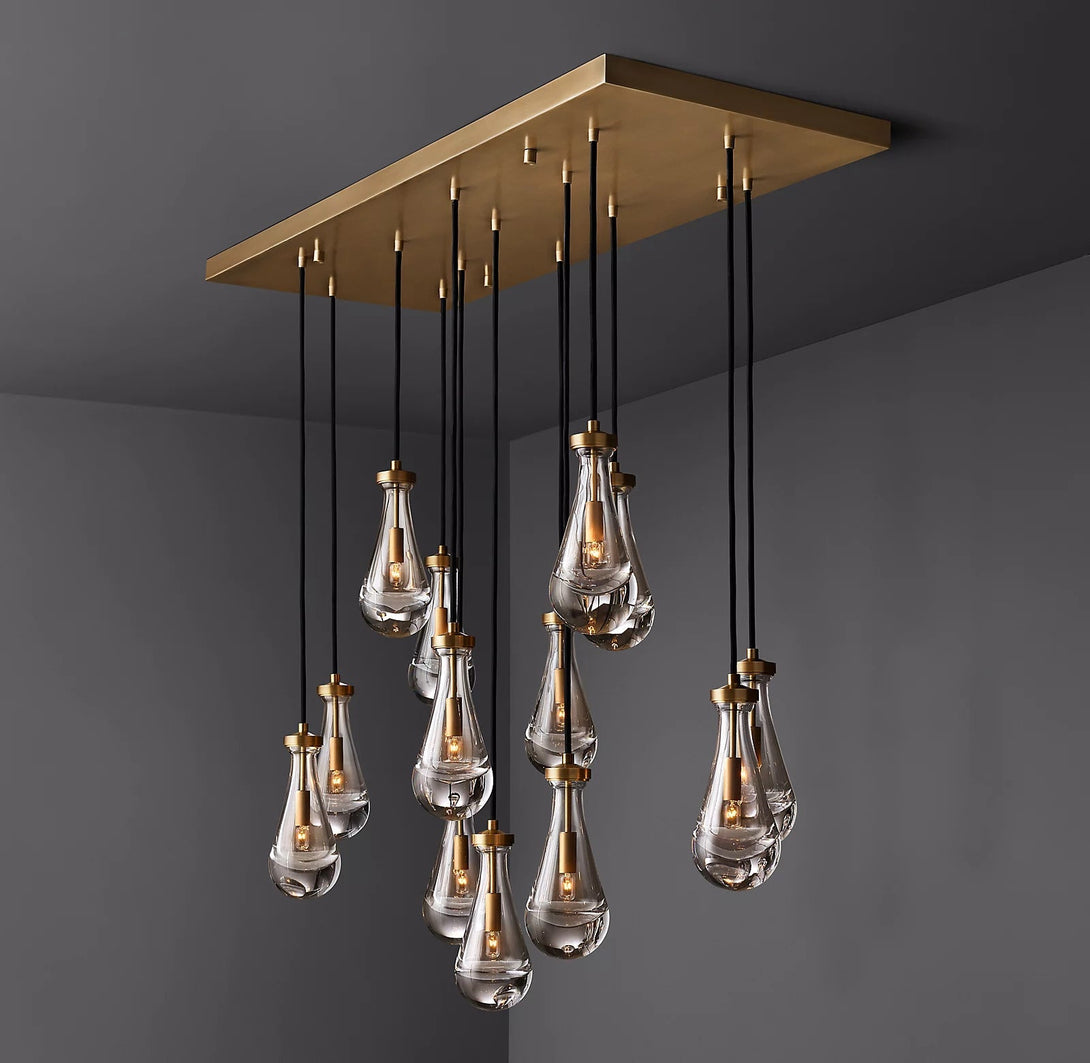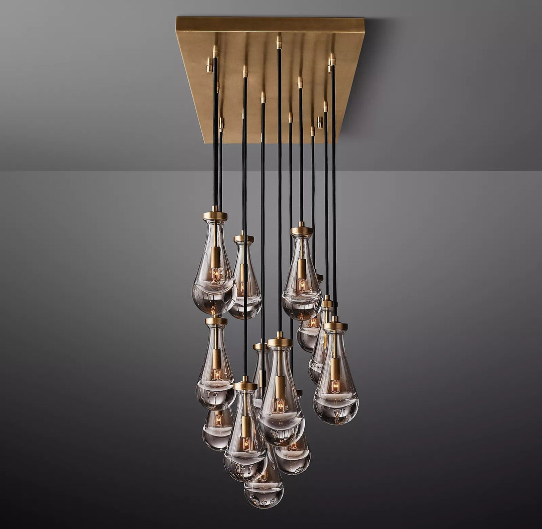 Raindrop Chandelier engages the viewer in an ever-changing pattern of expansion and compression - much like the rhythm of a rainstorm itself. Suspended on slender black ropes, blown glass drops wrap around the bulbs - creating the illusion of underwater illumination - and cast glowing ripples that wash over the ceiling and walls.
