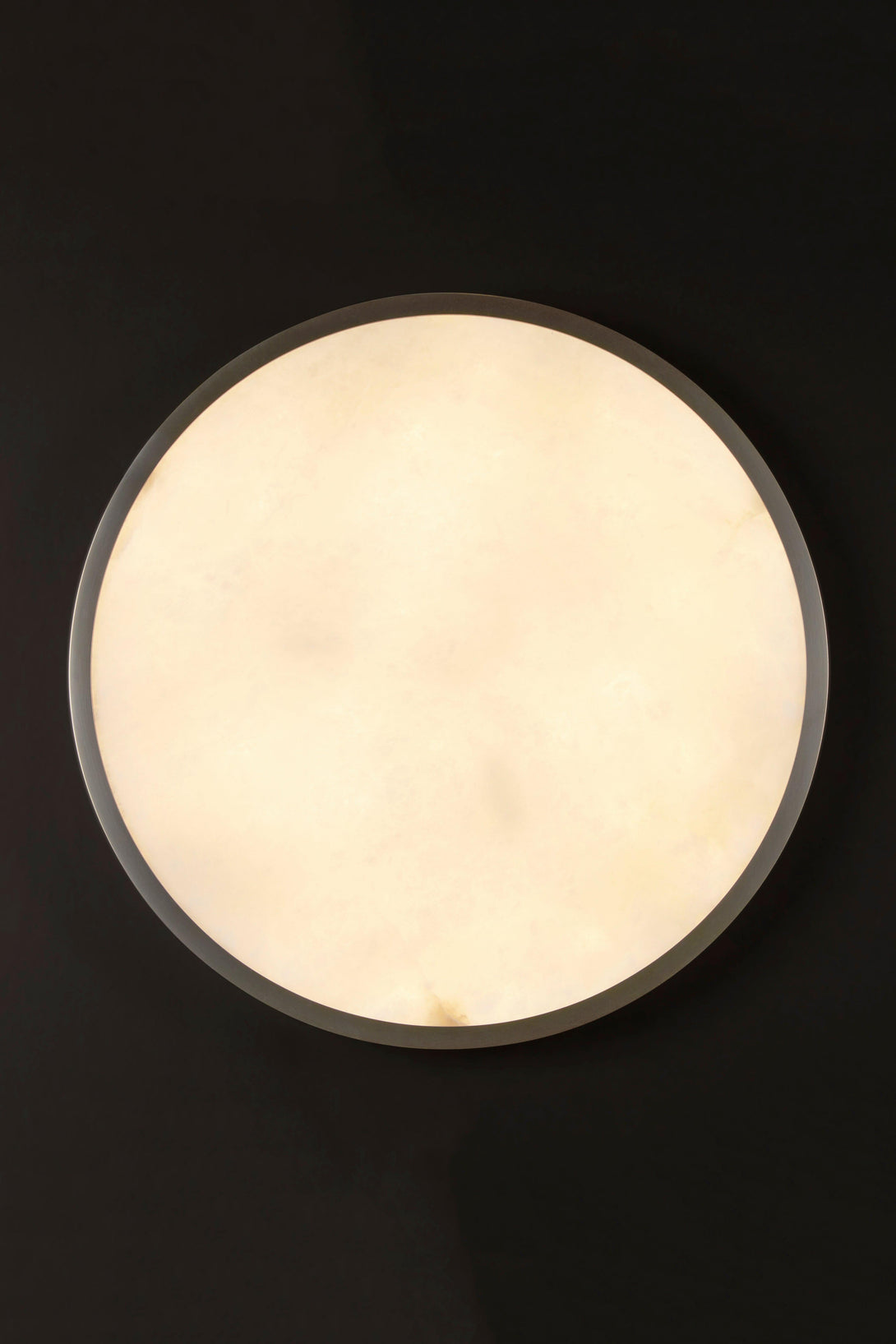 Introducing the Raleigh Round Alabaster Ceiling Light: a celestial marvel designed to captivate. This ceiling light fixture blends the allure of a moon-like, milk-hued fixture encased in a sleek metal round frame. Illuminate your space with ethereal elegance, casting a soft, ambient glow reminiscent of moonlit nights. Perfect for bedroom lights or enhancing closet lighting, the Raleigh Round Alabaster Ceiling Light introduces a celestial charm that transcends traditional lighting. Elevate your home décor with this round alabaster wall fixture, bringing a touch of cosmic sophistication. It is offered in two sizes: 20" wide x 3/4" deep and 12" wide x 1 3/4" deep.