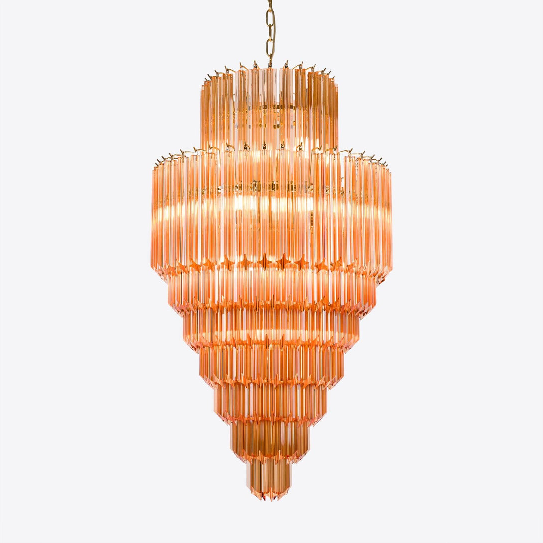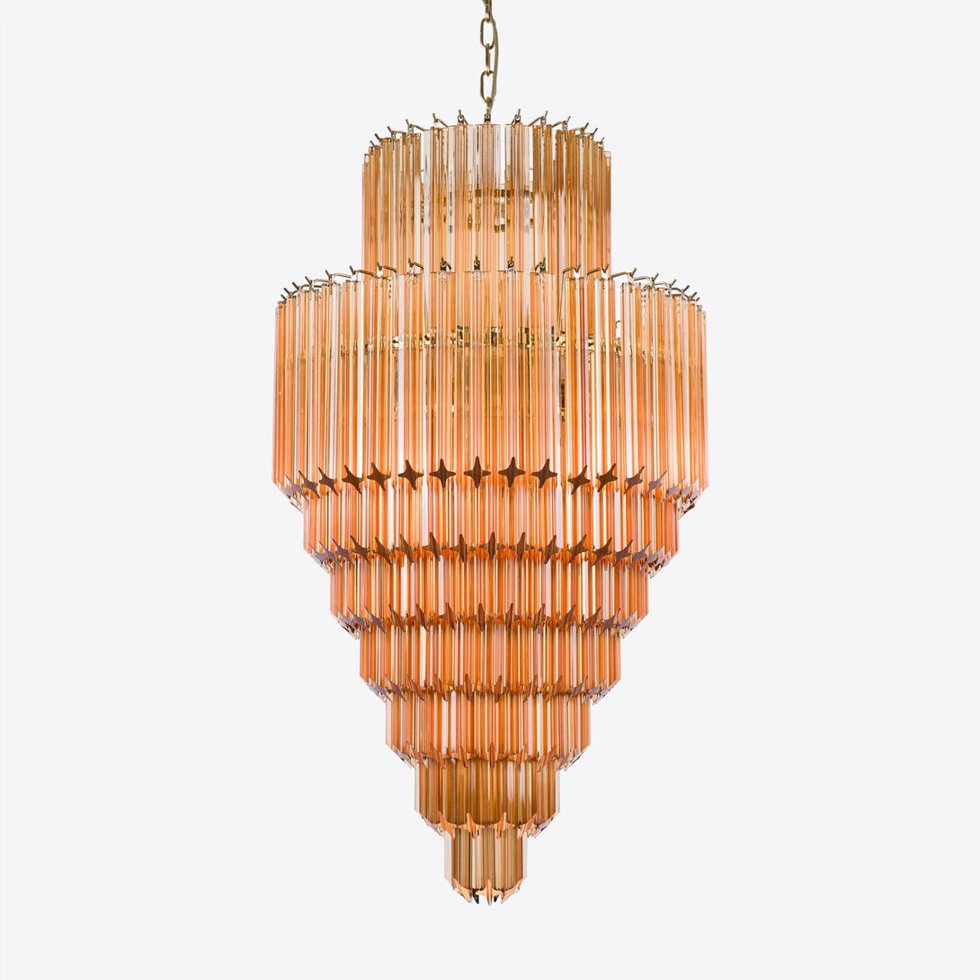 A show-stopping mid-century Murano inspired chandelier formed of diamond-shaped spears of glass – available in Amber and Pink.