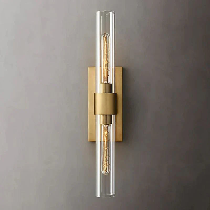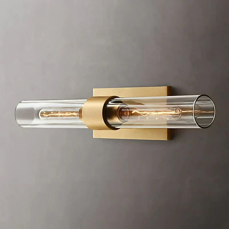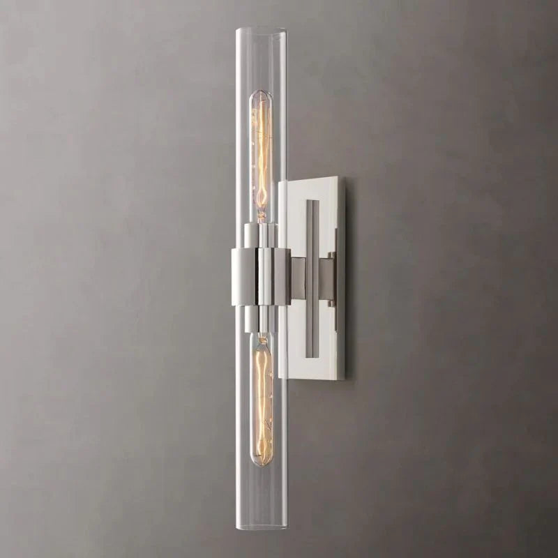 This wall sconce , Art Deco forms are re-imagined with a modern minimalist sensibility. Made of sturdy steel, the unadorned metal band holds the slender glass cylinder in a state of perfect balance. The shades of the chandeliers in this collection are made of blown glass, and within each lamp, Edison bulbs shine like flickering candles.