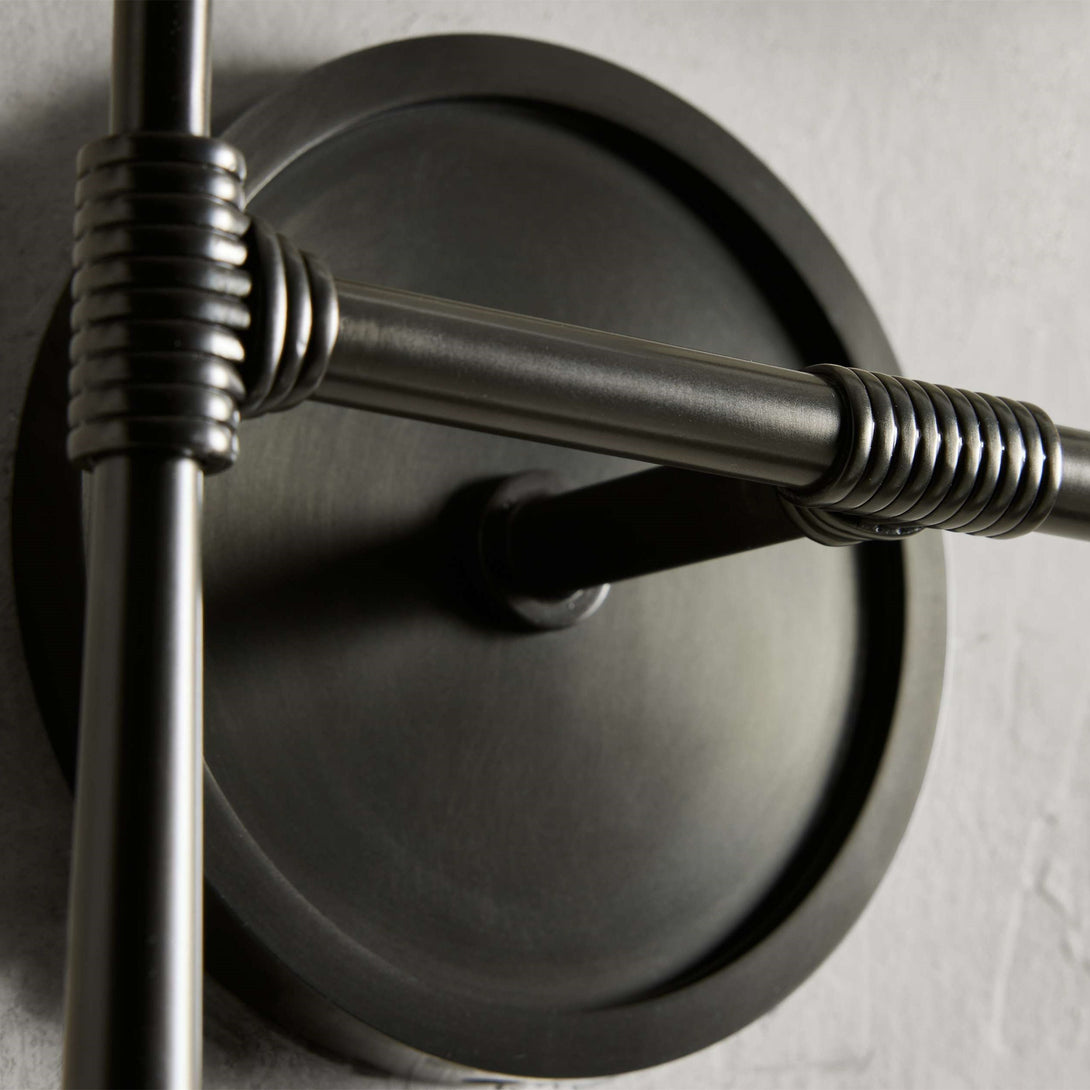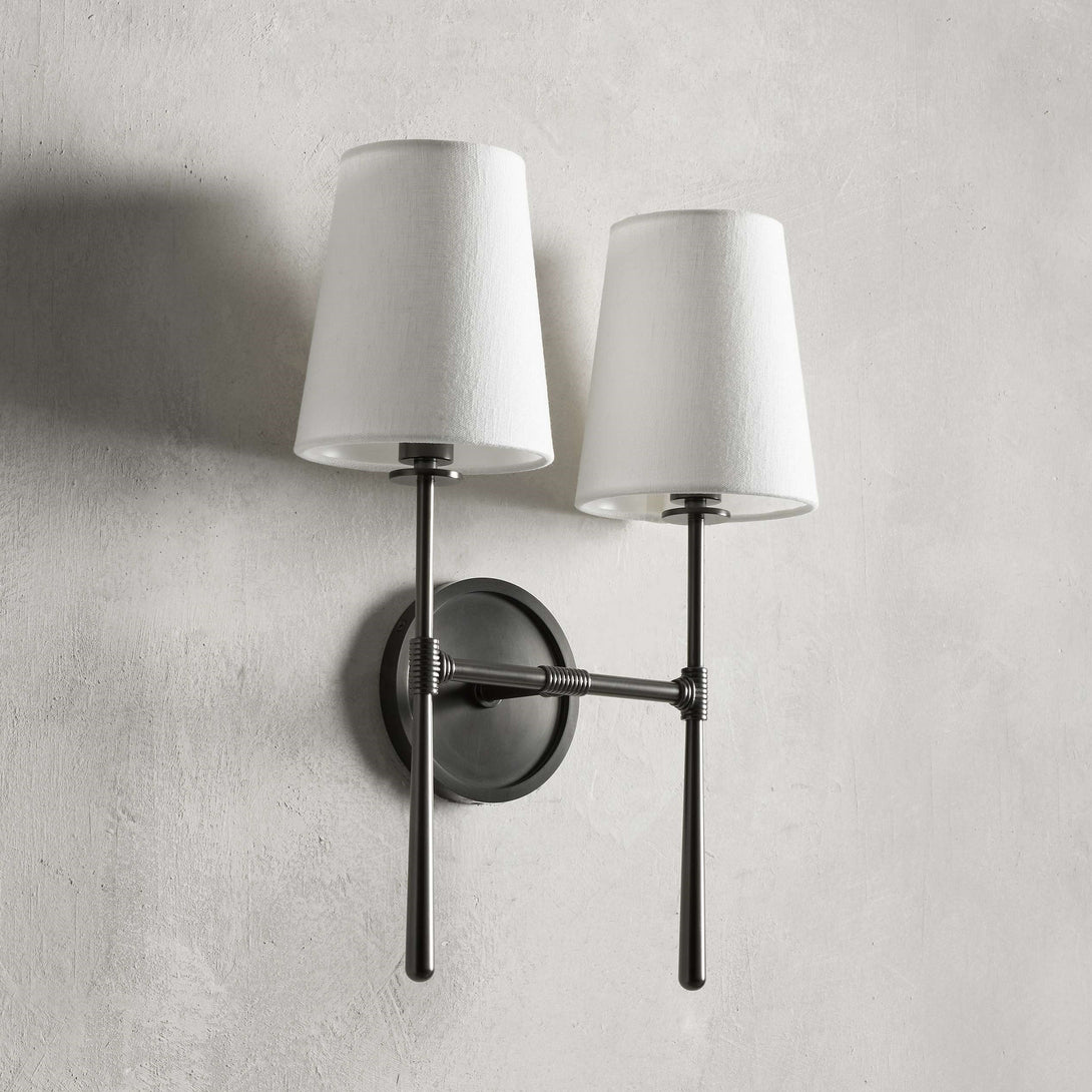 - Crafted from steel with a bronze plated or burnished brass finish and tapered linen shades.