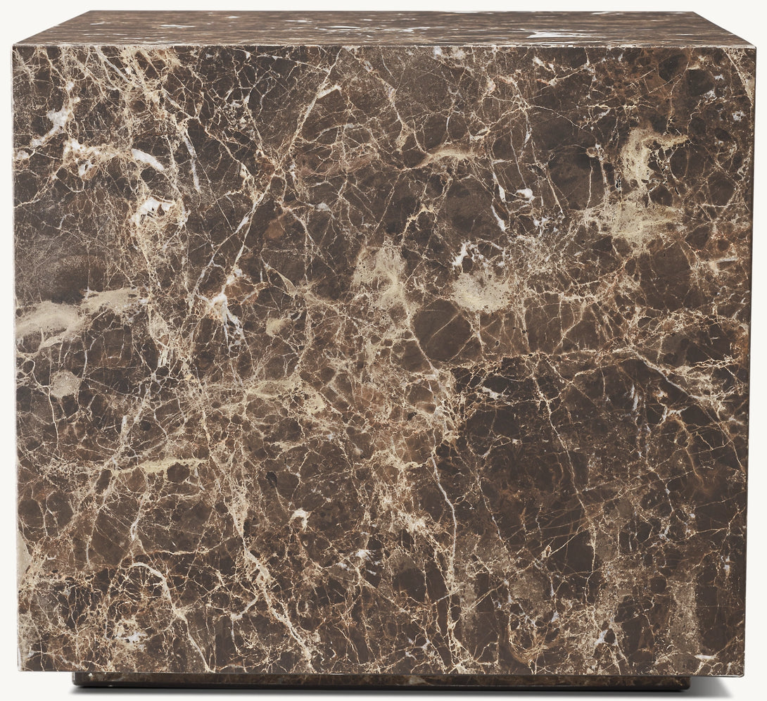 The elemental shape of the Rocco table showcases the beauty of natural stone, rich with the variable color tones and vein patterning that make each piece unique. A recessed plinth base casts a shadow below the sculptural form, lending a floating effect.