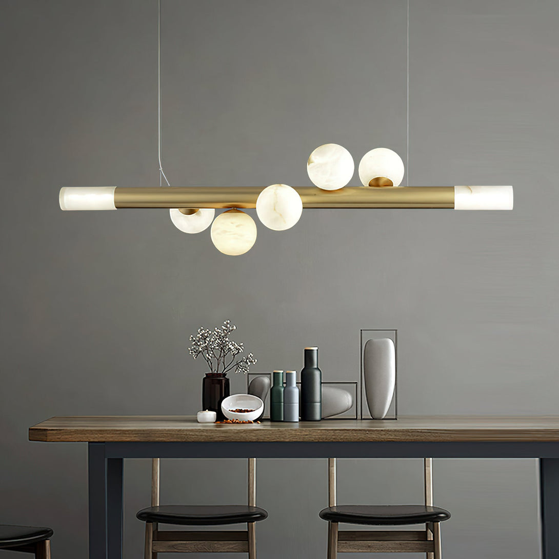 This beautiful chandelier composed of 5 glass balls with a white alabaster finish and a brass body will add an elegant touch to your interior. It provides a warm and soft lighting due to the diffusion of the light.