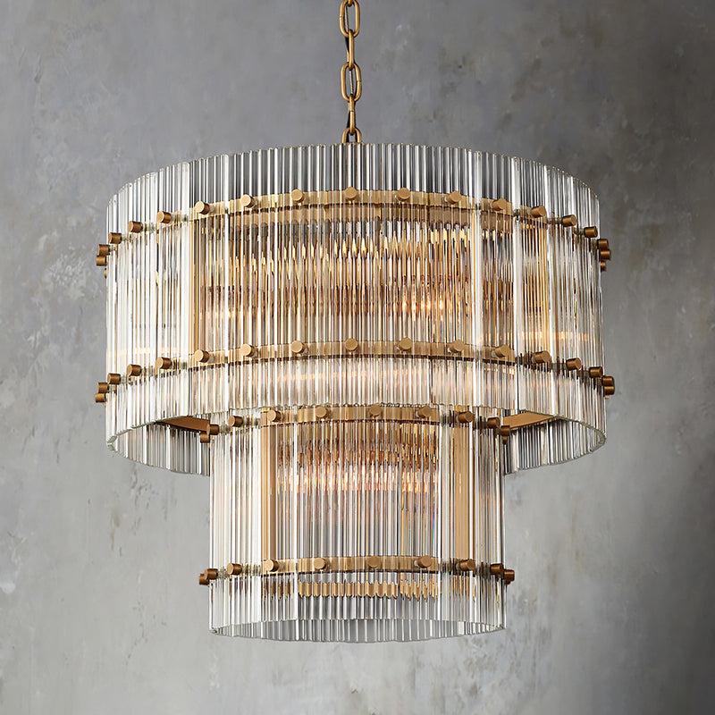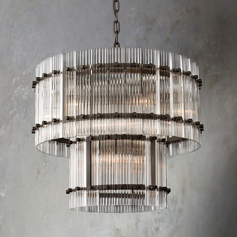 This chandelier is crafted from a steel frame and hand-fluted glass panels. Our fixture evokes the glamour of 1960's Italian glass lamps. Within a sleek metal frame, dozens of glass panels are hand-raked into fluted shapes, producing a dramatic play of light and softly diffused light. Bright light shines through the glass and the light is mapped onto the walls and floor