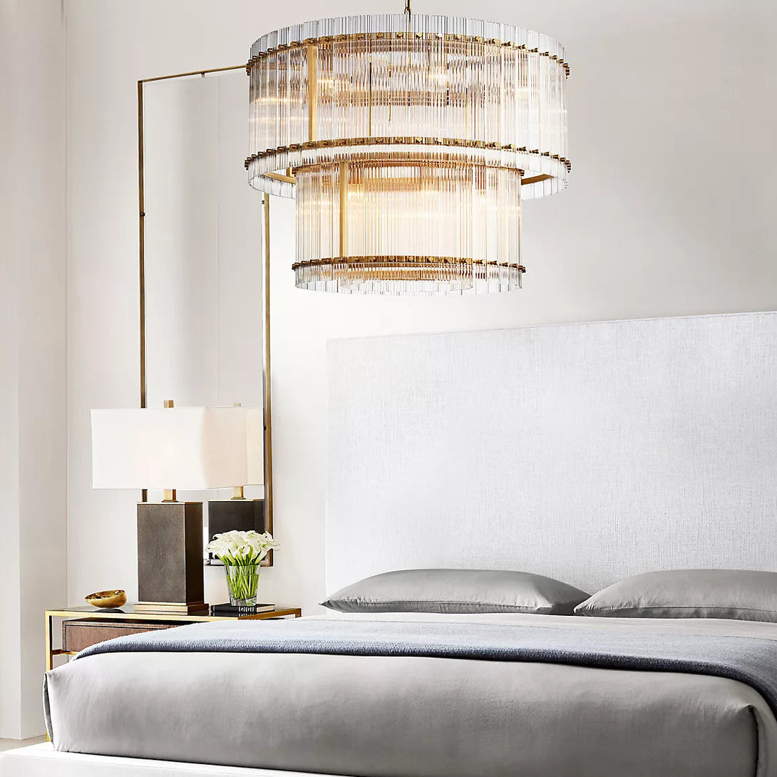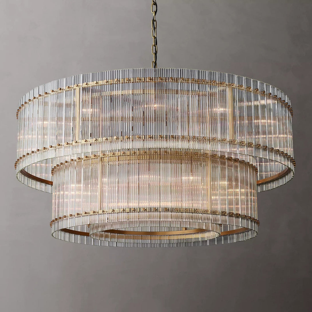 This chandelier is crafted from a steel frame and hand-fluted glass panels. Our fixture evokes the glamour of 1960's Italian glass lamps. Within a sleek metal frame, dozens of glass panels are hand-raked into fluted shapes, producing a dramatic play of light and softly diffused light. Bright light shines through the glass and the light is mapped onto the walls and floor