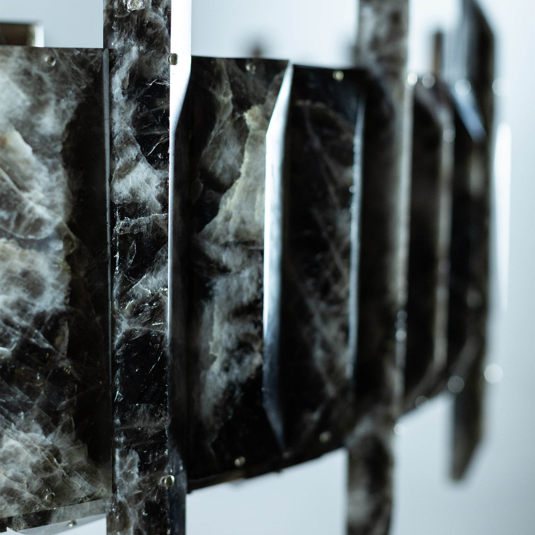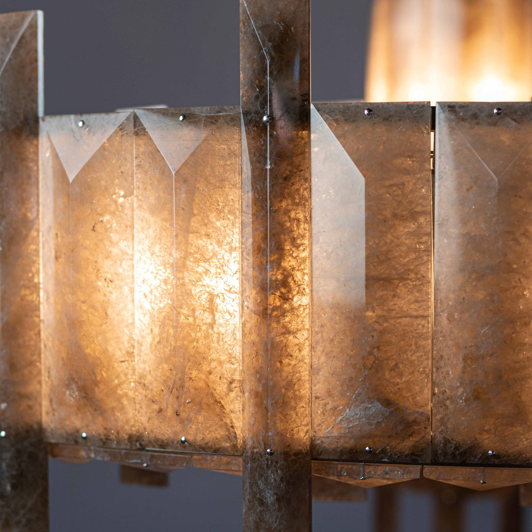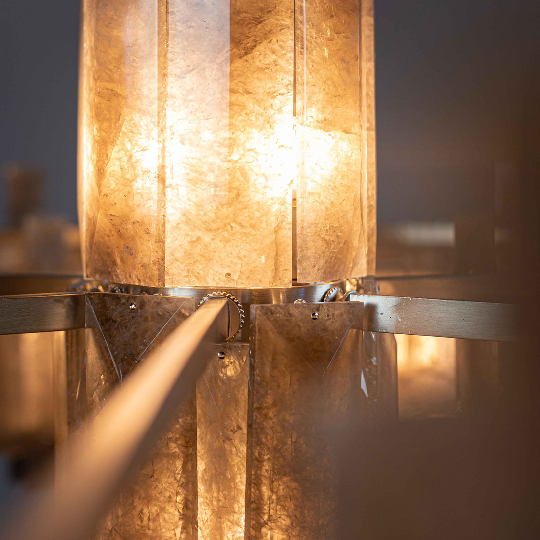 In the grand tradition of semi-precious stones, Mathieu shows a particularly innovative example with a very seductive aesthetic. This collection’s theme, interstellar, recounts the history of the planets; a shuttle covered in rock crystal allegedly stole light from the stars to light our sleepless nights. One can also imagine the mechanical gears and industrial design that inspired the art of the twentieth and twenty-first centuries chandelier becoming the signature of Mathieu Lustrerie. It was inevitable one should be acquired by the Mobilier National Français for its early twenty-first century decorative art collection.