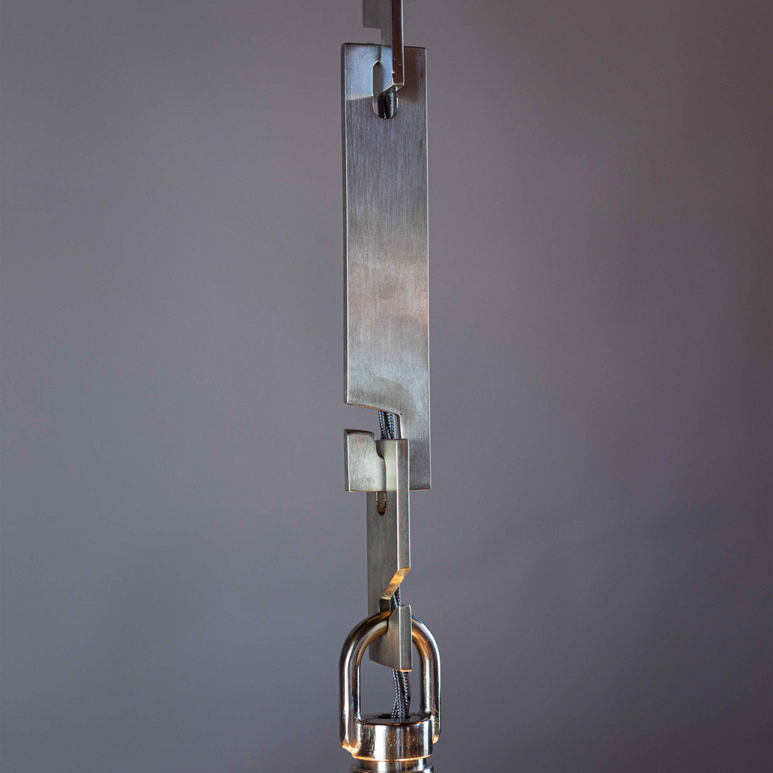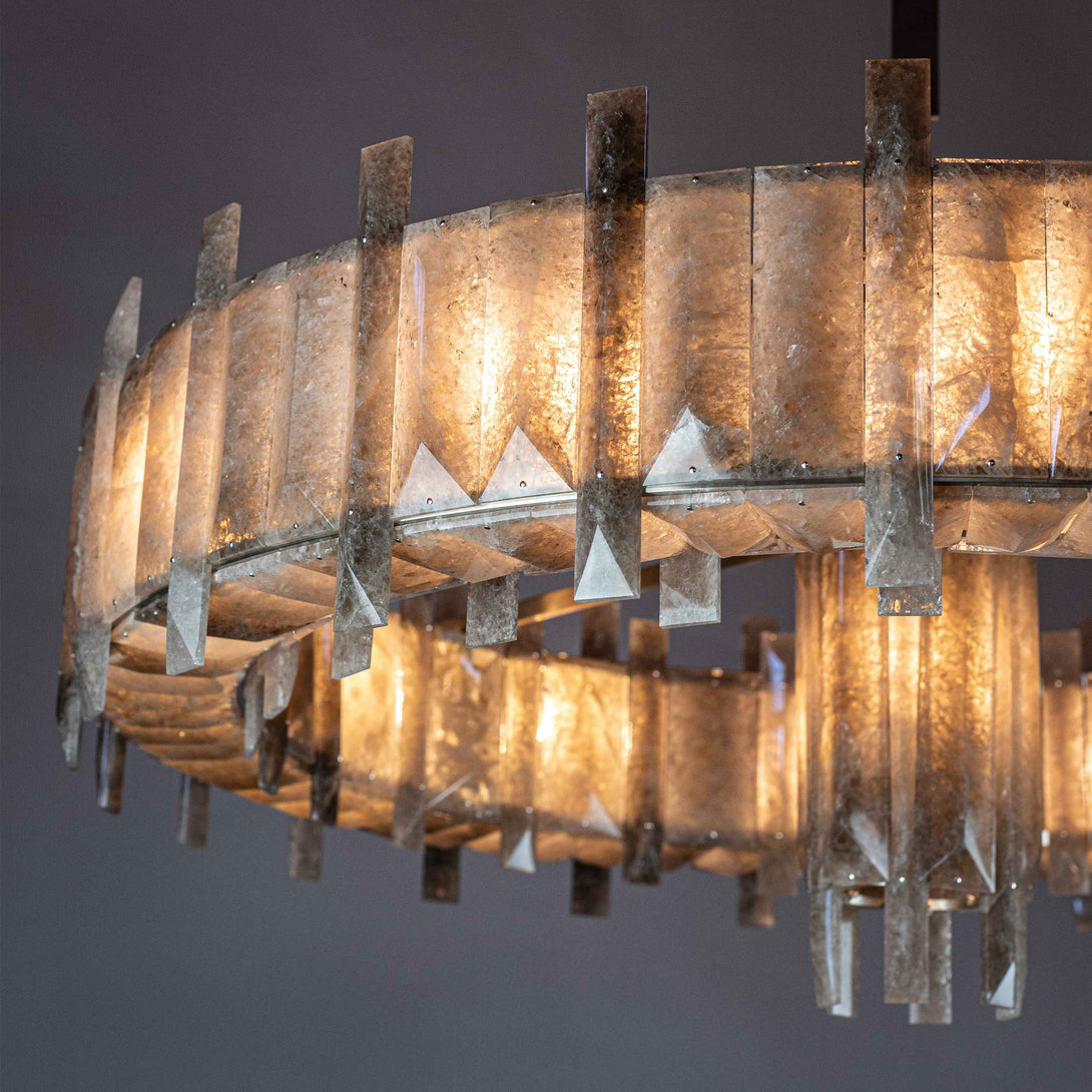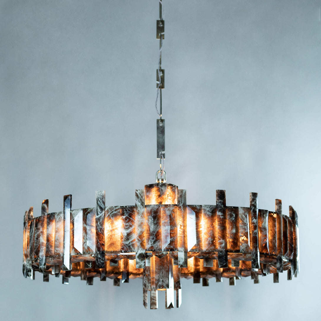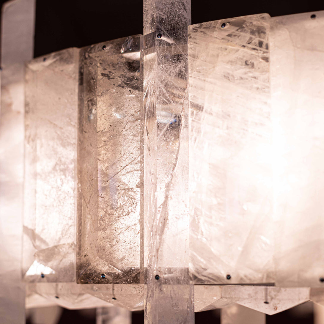 In the grand tradition of semi-precious stones, Mathieu shows a particularly innovative example with a very seductive aesthetic. This collection’s theme, interstellar, recounts the history of the planets; a shuttle covered in rock crystal allegedly stole light from the stars to light our sleepless nights. One can also imagine the mechanical gears and industrial design that inspired the art of the twentieth and twenty-first centuries chandelier becoming the signature of Mathieu Lustrerie. It was inevitable one should be acquired by the Mobilier National Français for its early twenty-first century decorative art collection.