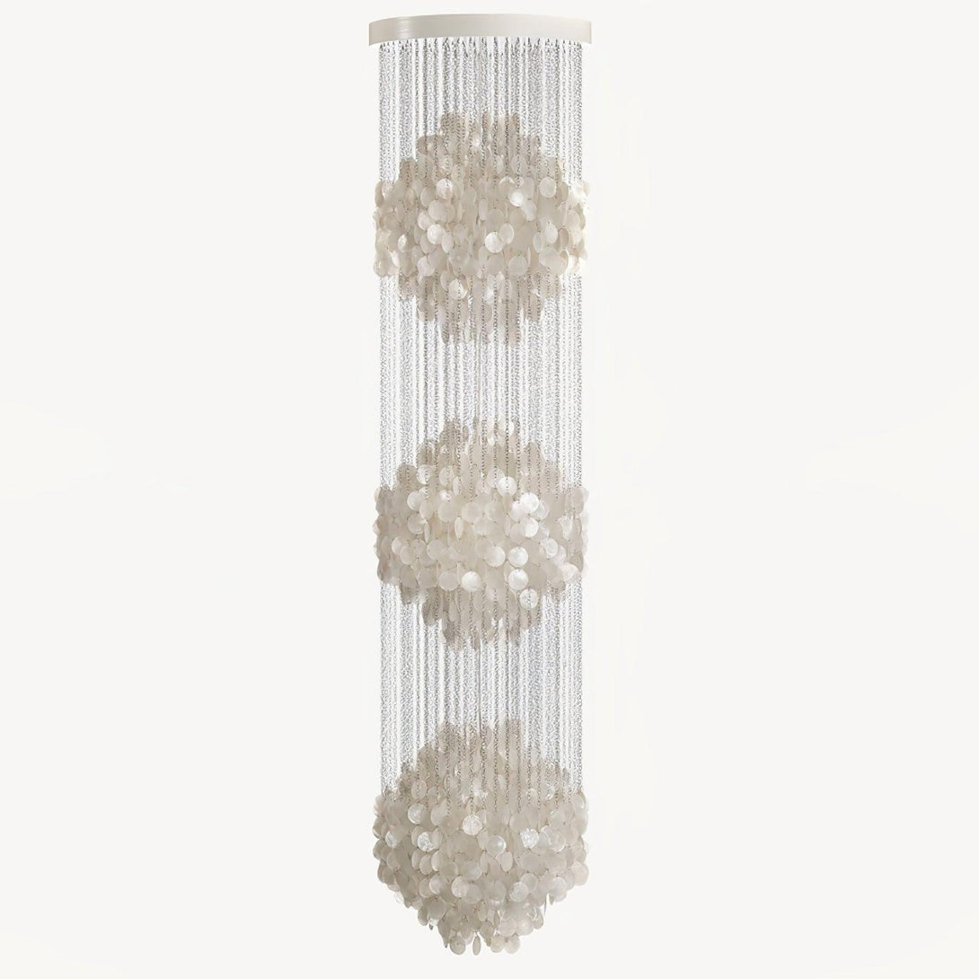 Designed to mimic a tranquil waterfall, this chandelier features strands of delicate shells that fall gracefully from a sleek metallic crown. Each shell is carefully selected and strung, creating a cascade of soft luminescence, casting enchanting patterns on your walls. Ideal for coastal-inspired decors or to bring a touch of nature’s calm into urban spaces, this chandelier is a conversation piece that will elevate any room’s aesthetic. Perfect for living areas, dining rooms, or high-ceiling entryways, the Shell Cascade Chandelier is more than a light fixture; it’s a centerpiece that embodies both art and light.