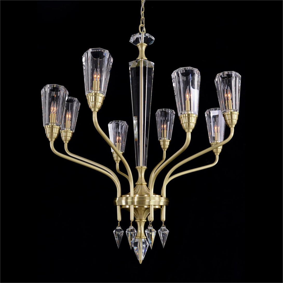 An elegant eight-light chandelier featuring a tapered crystal center column and matching crystal shades, set upon delicate ribbed arms in plated satin gold. A central crystal finial, ringed by eight faceted crystals with a metal tip, completes the refined design.