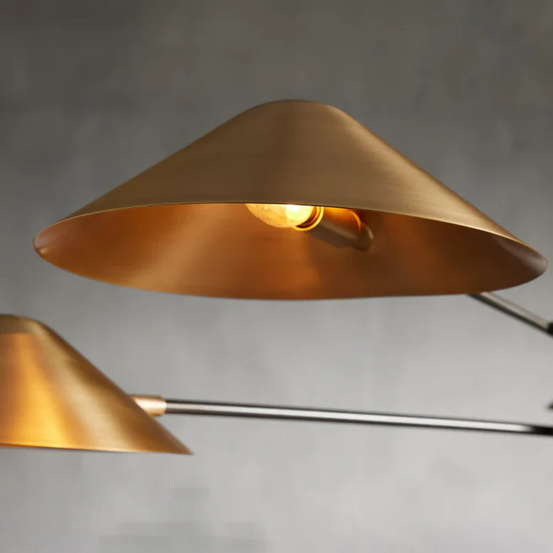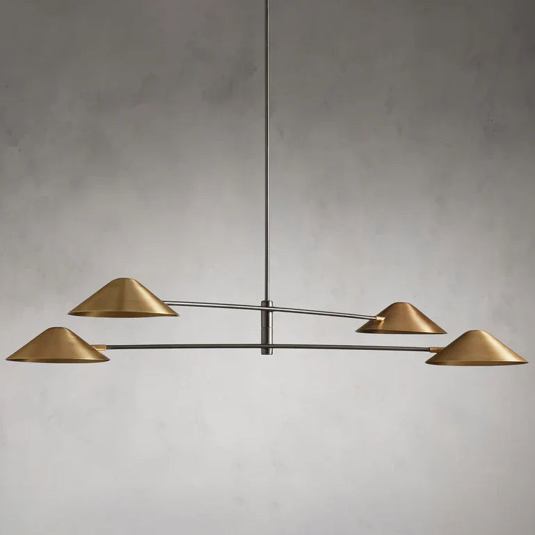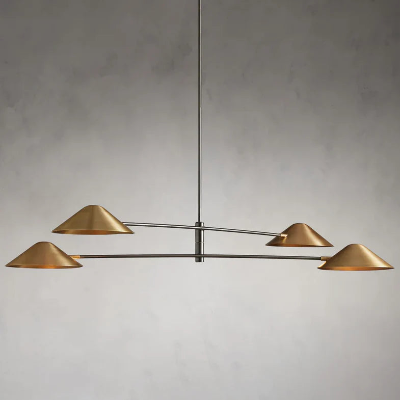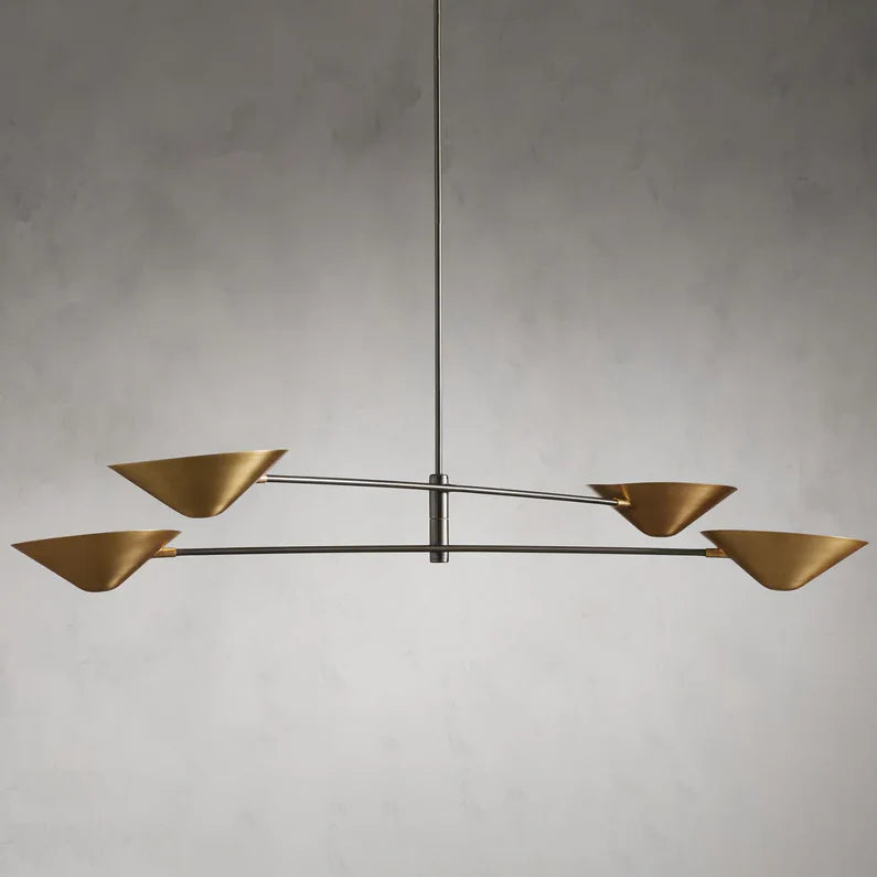 - Chandelier features pivoting arms for a linear or x-shaped silhouette and rotating shades to cascade light up or down.