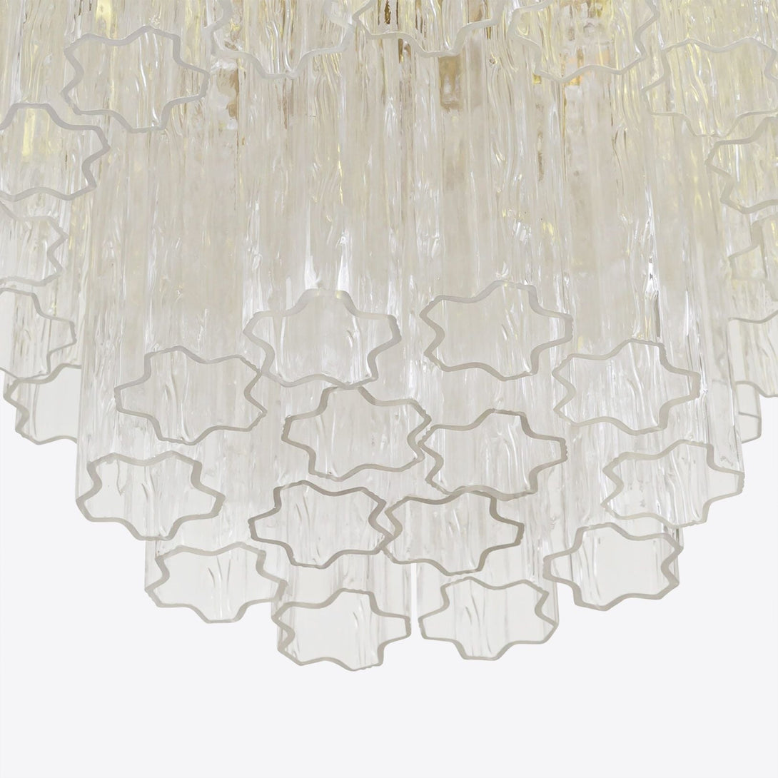 Two tiers of fluted glass tubes create this small but perfectly formed mid-century inspired chandelier. The textured glass tubes are individually hung from a Satin Brass frame. This style is available in three colours; a rich, sophisticated Smoked Quartz, a fresh blush Pink or clear glass.